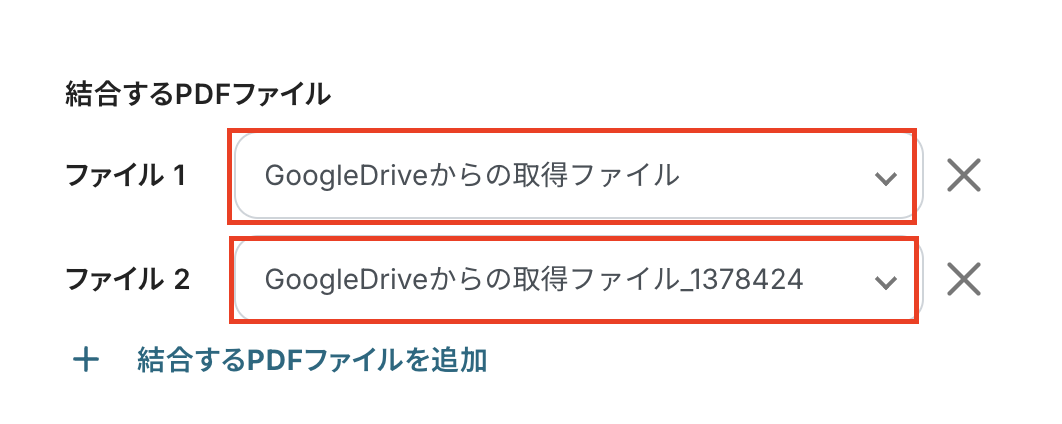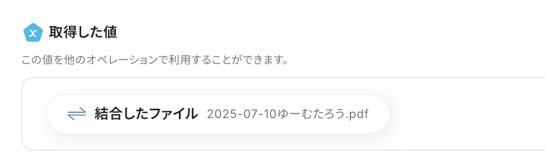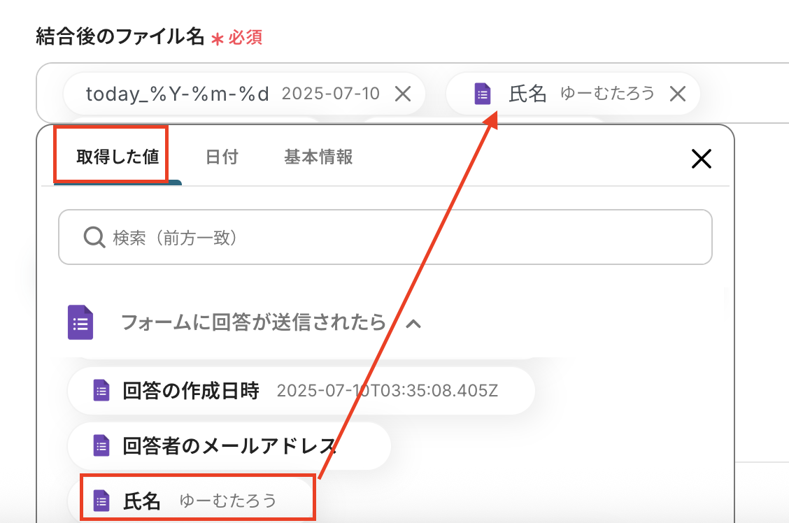 結合後のファイル名は取得した値や日付の項目を活用して入力し、設定してみましょう。