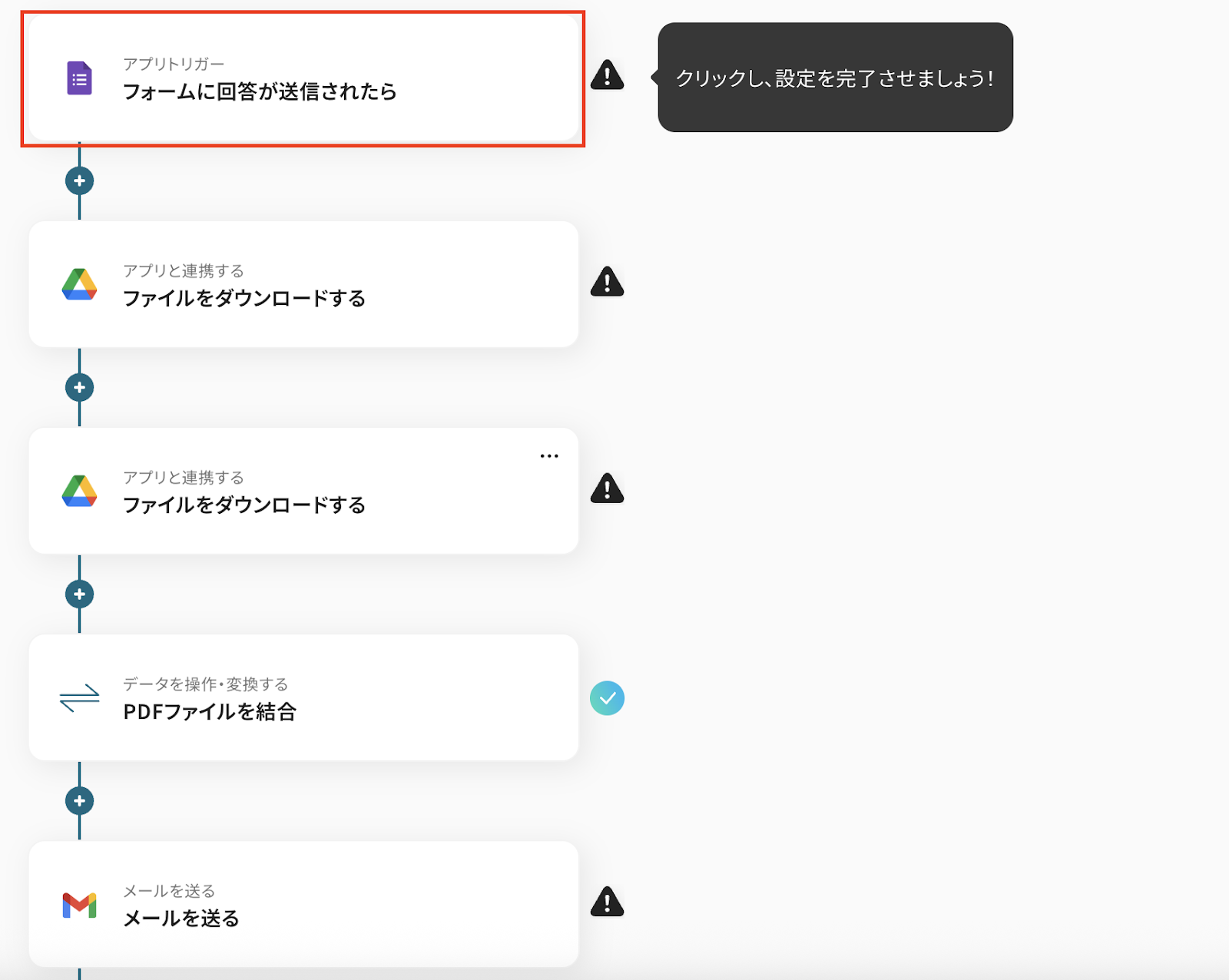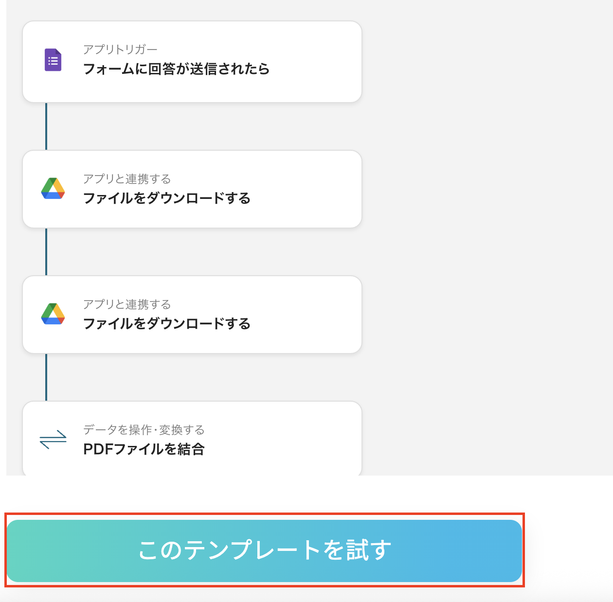 それではここから代表的な例として、Googleフォームで複数のファイルが添付・送信された際に、それらを1つのPDFファイルに自動で結合し、指定した宛先にGmailで送信するフローを解説していきます!