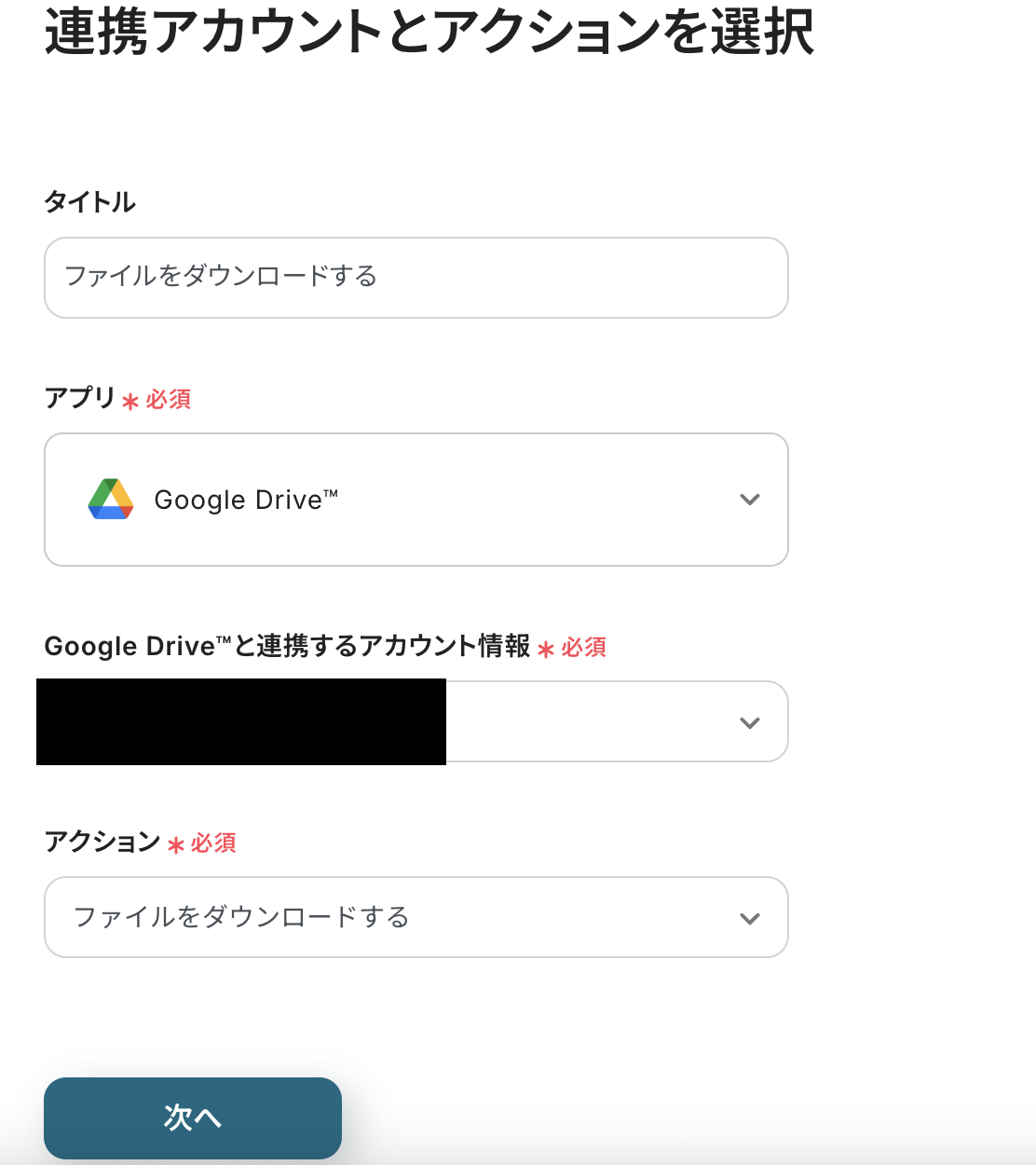 連携アカウントとアクションを選択の画面は設定ができているので、以下を確認し次へをクリックしてください。