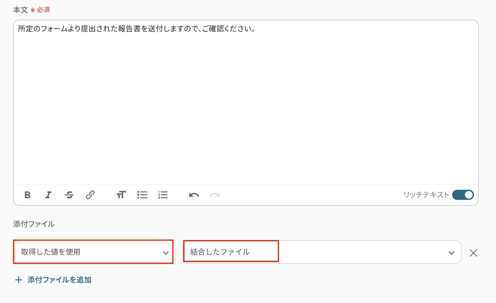 添付ファイルは、「取得した値を使用」「結合したファイル」を選択して次へをクリックします。