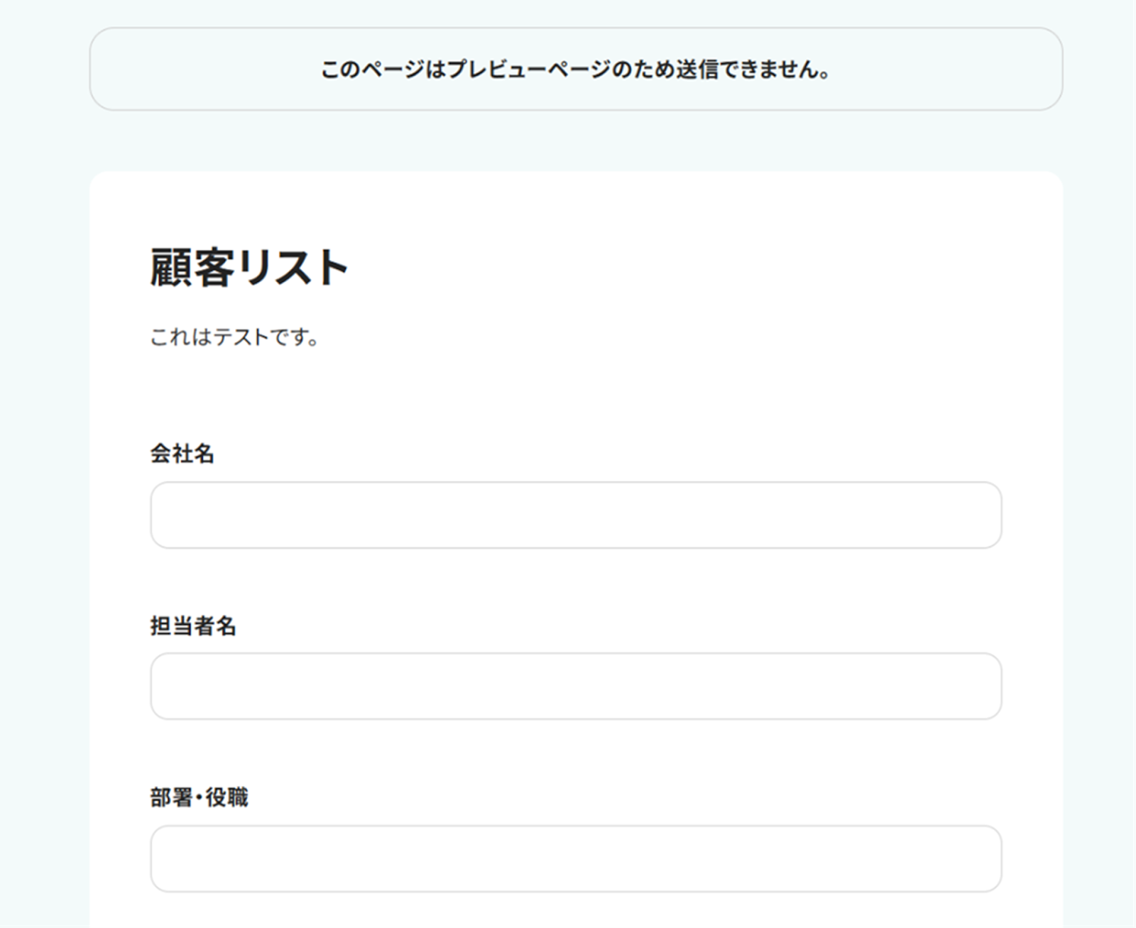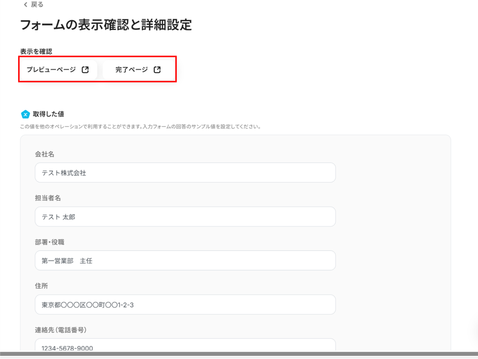 (3)「フォームの表示確認と詳細設定」画面から、フォームの表示を確認します。 赤枠のプレビューページ、完了ページをクリックすると回答者にどのように見えるのかを確認することができます! 取得した値には、テスト回答を直接入力しました。