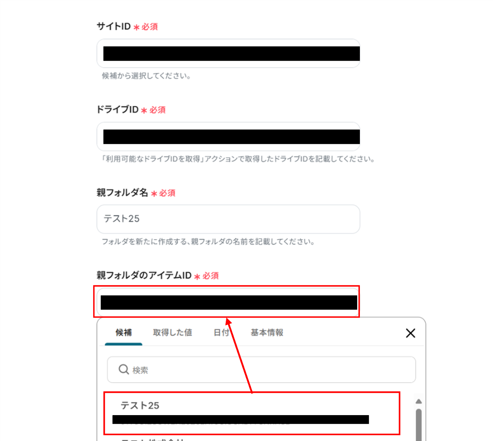 サイトID、ドライブID、親フォルダのアイテムID:下記のように候補から選択。