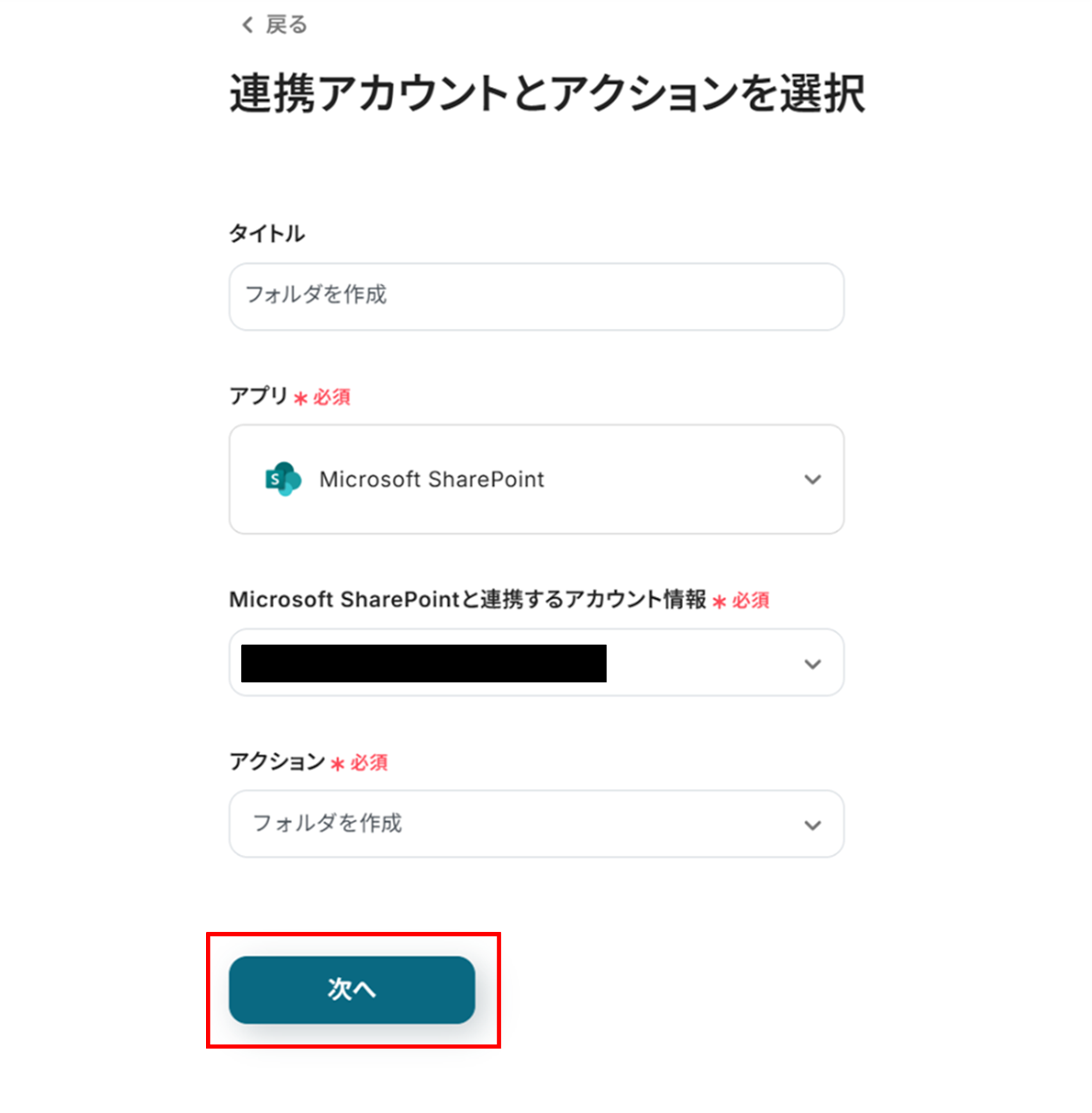 (2)タイトルと連携するアカウント情報を任意で設定し、アクションはテンプレート通りのまま「次へ」をクリックして進んでください。