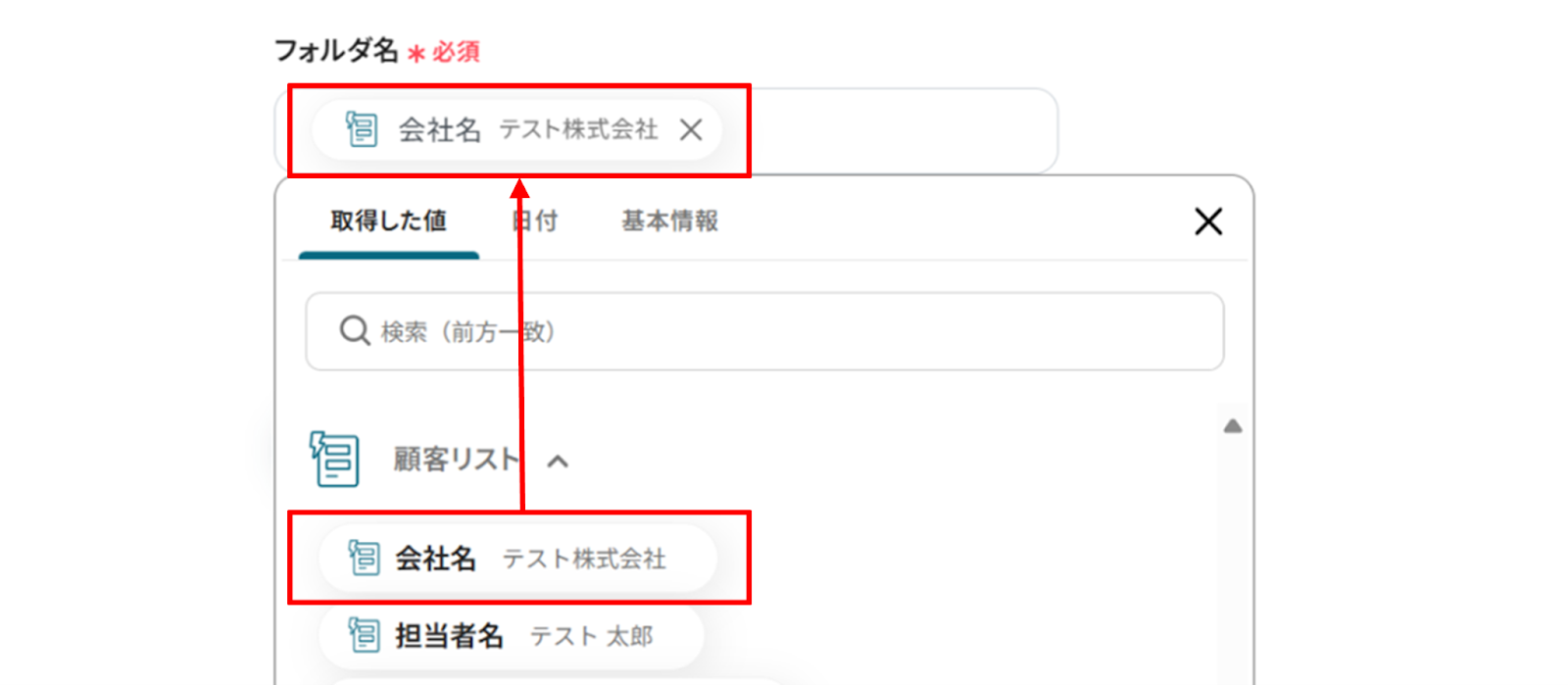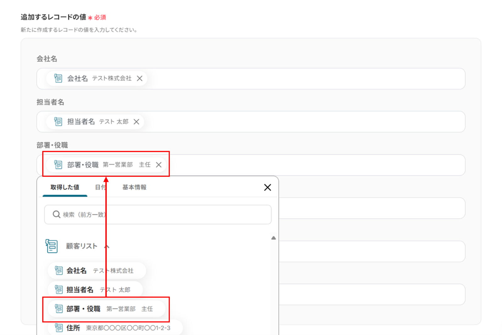 (3)追加するレコードの値を「取得した値」から選択します。 入力が終わったら「テスト」をクリックしましょう!