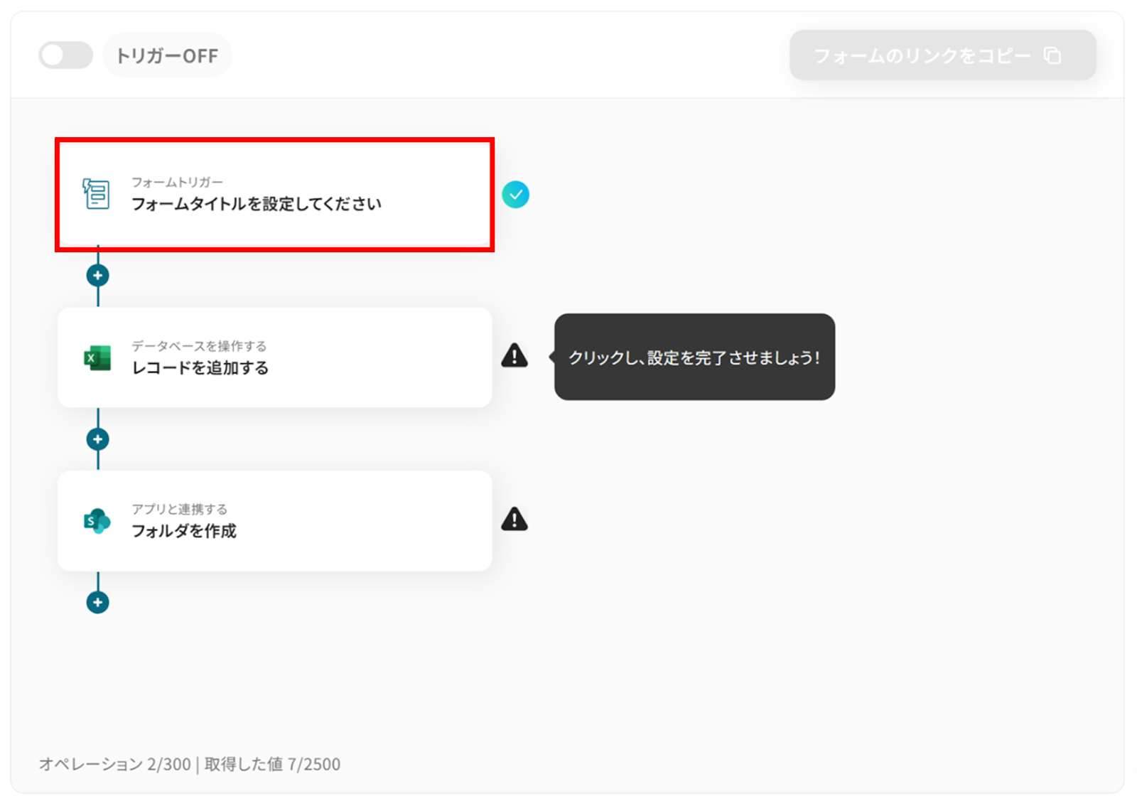 (1)Yoomを使って回答フォームを作成していきます! フォームトリガーの「フォームタイトルを設定してください 」をクリックします。