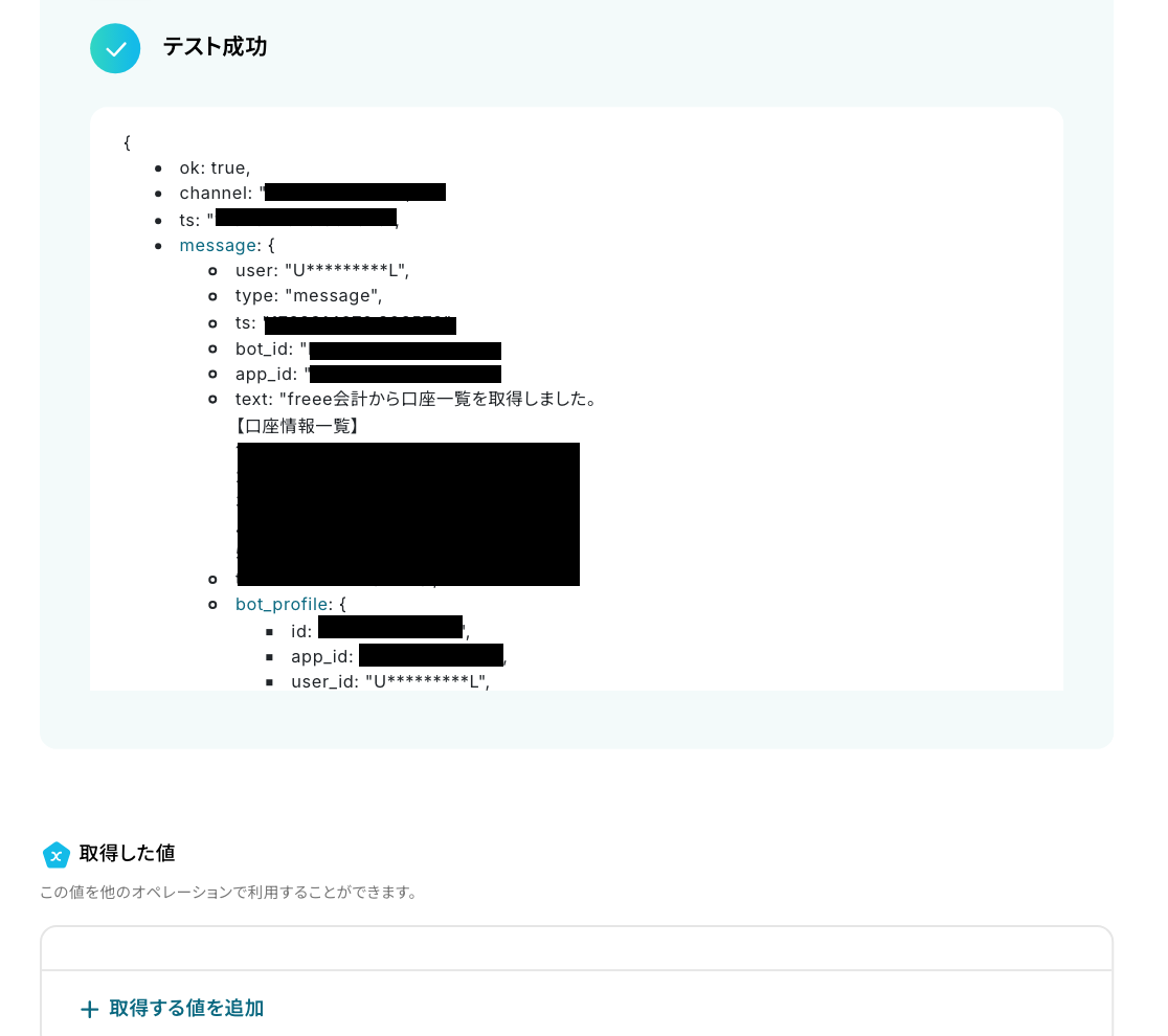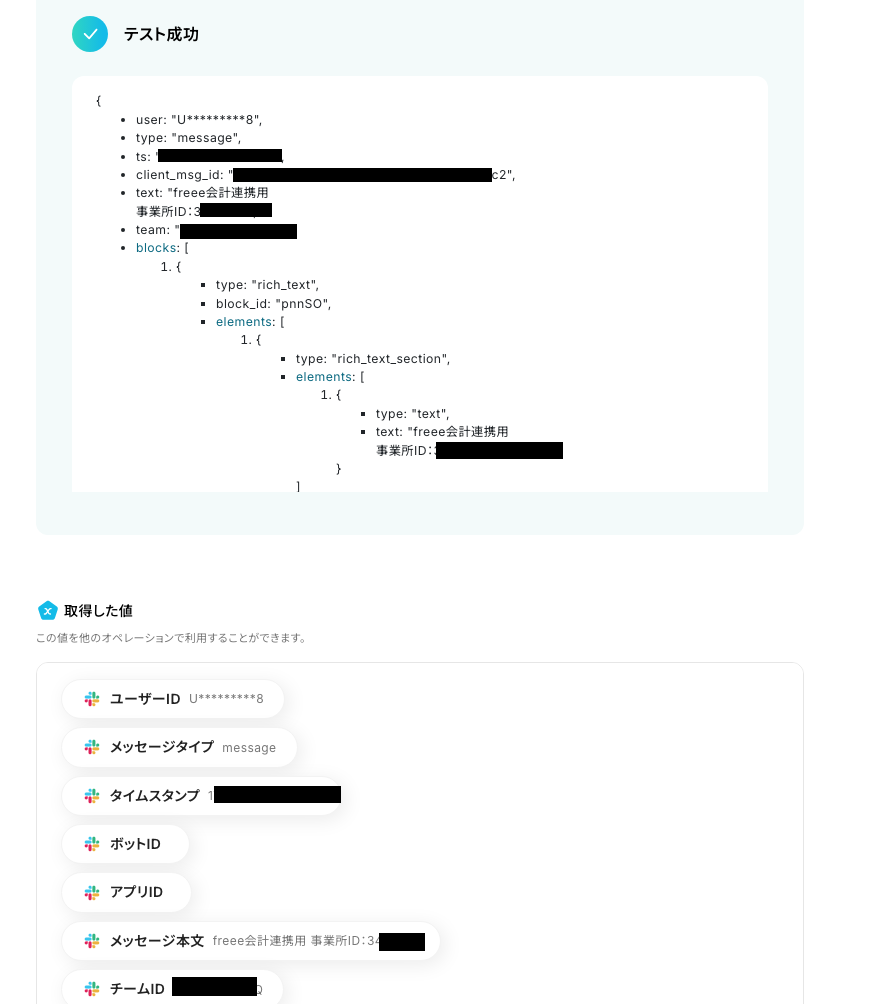 テストに成功すると、Slackで投稿した内容が取得した値に表示されます。