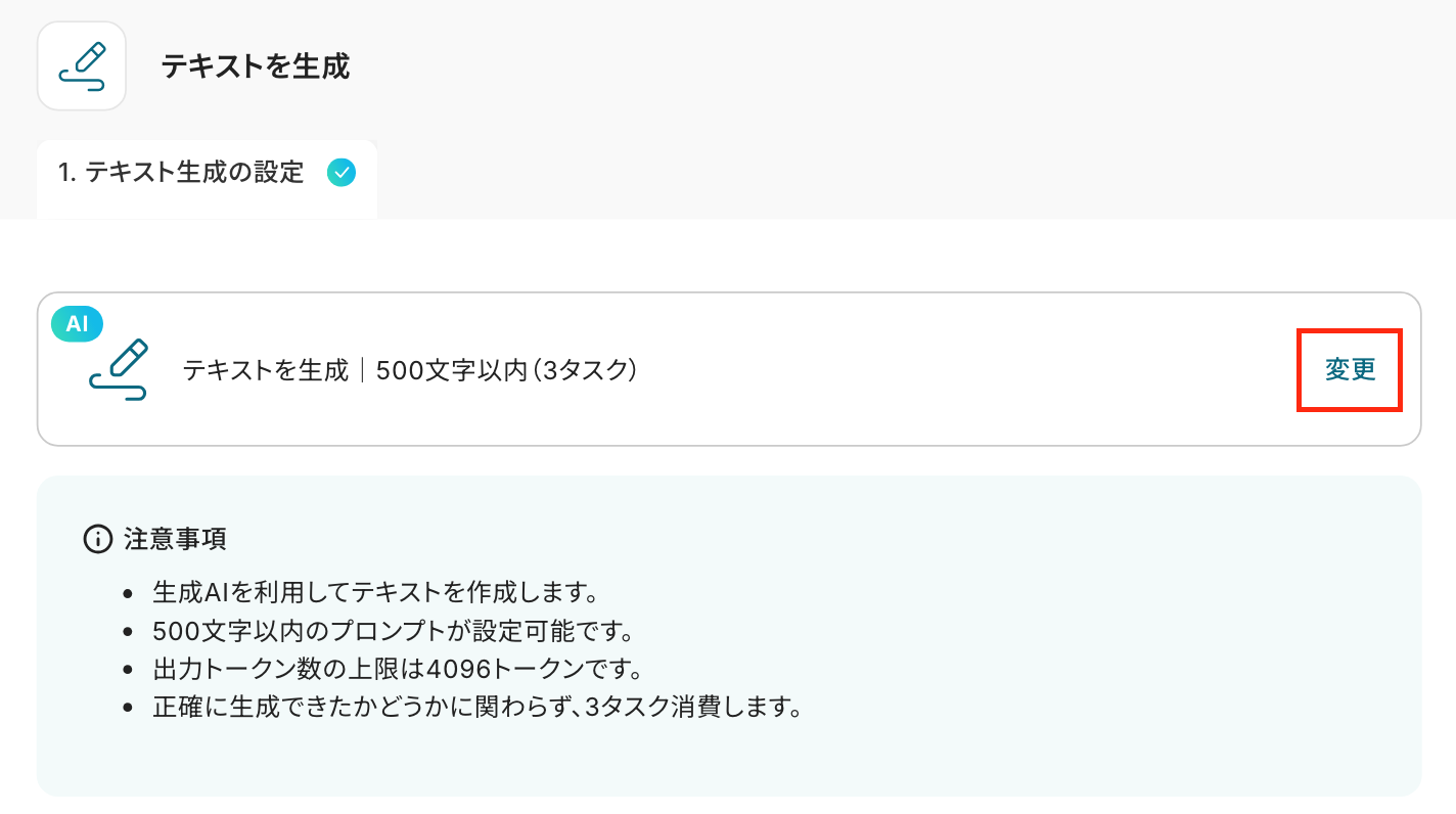 赤枠部分の「変更」をクリックすると、「指示可能なプロンプトの文字数」 を変更できます。