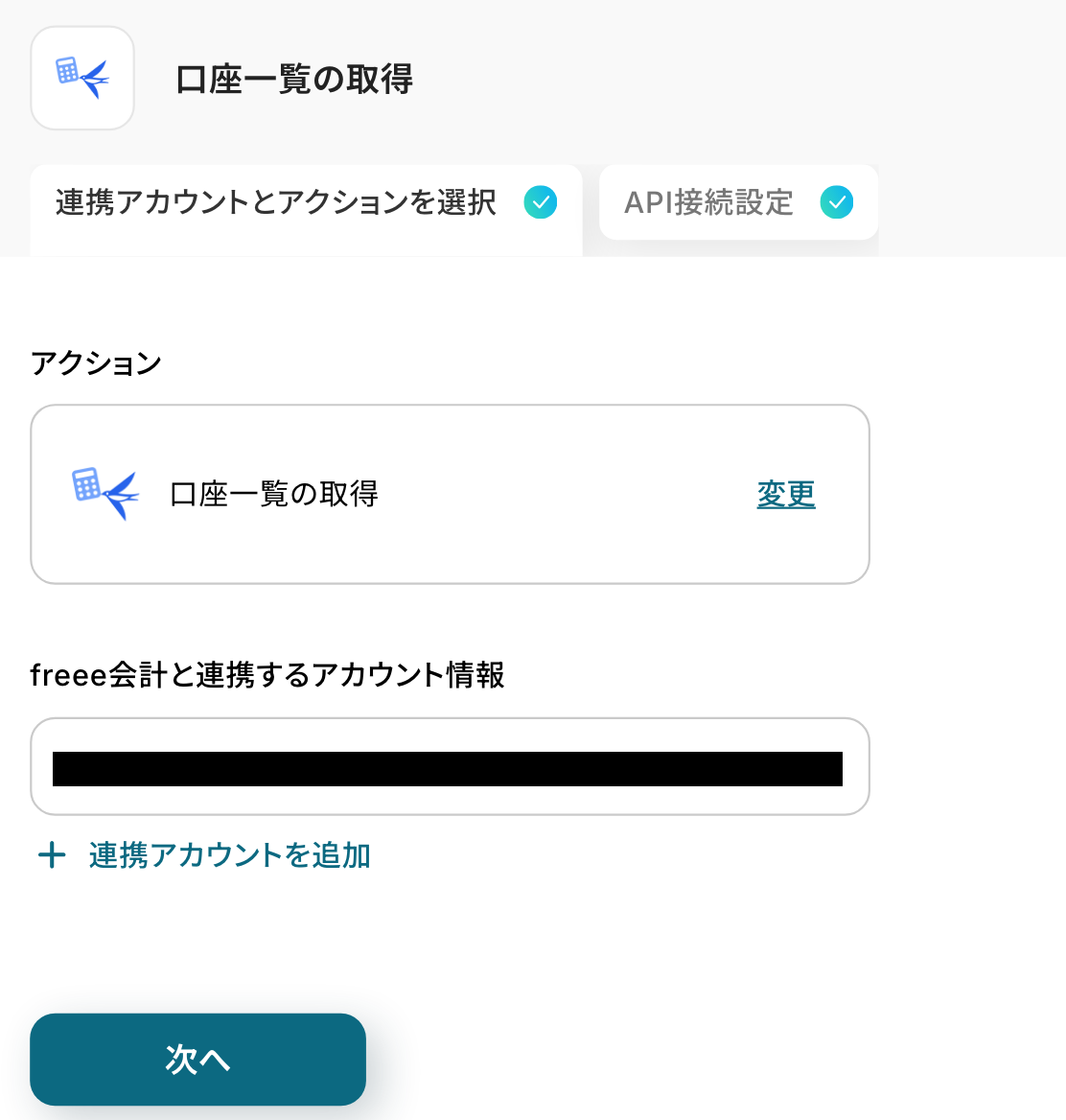 ここでは、freee会計の口座一覧を取得する設定を行います。