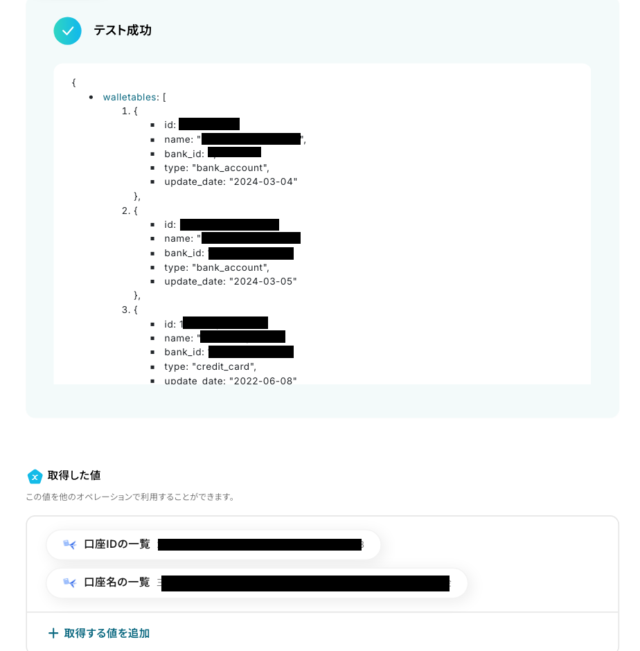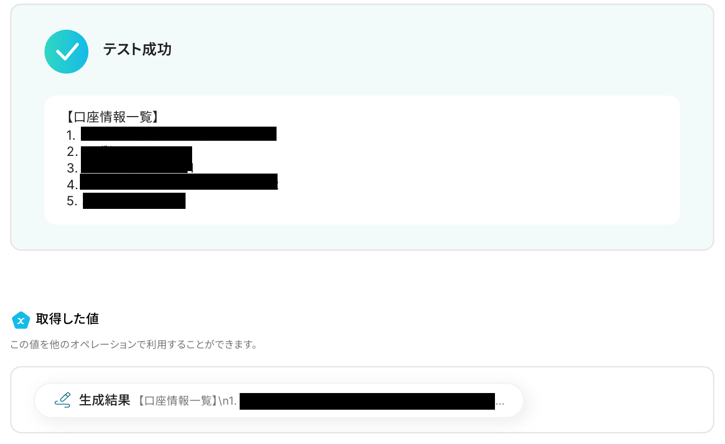テストに成功すると、取得した値として口座一覧が表示されます。