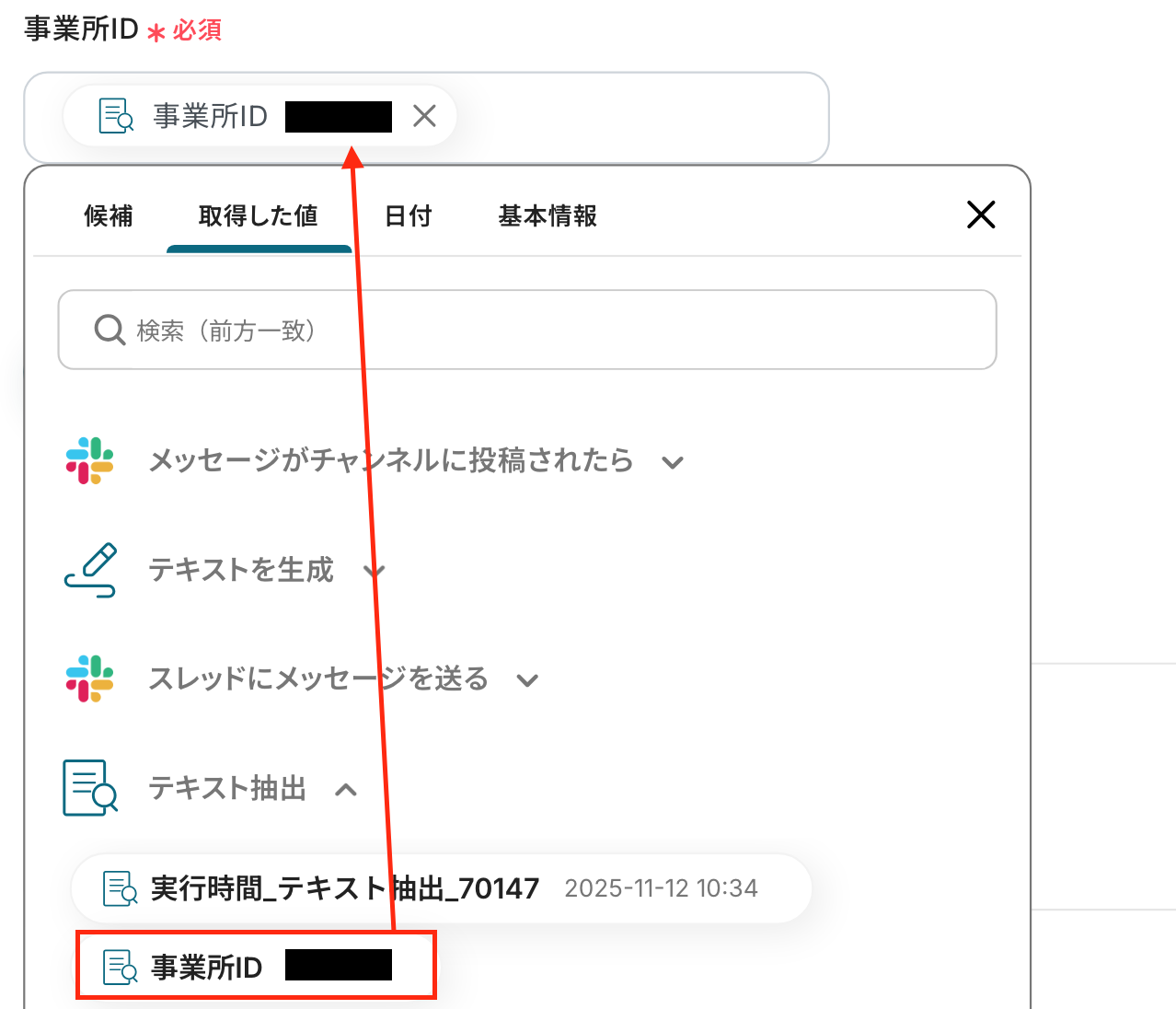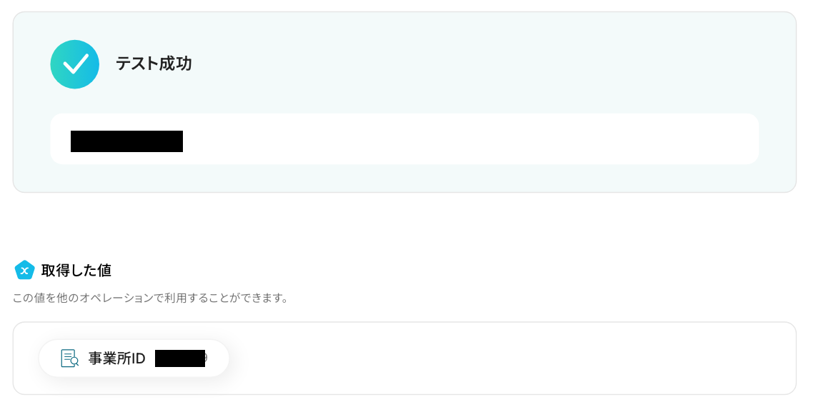 テストが成功すると、取得した値が表示されます。事業所IDを抽出することができましたね。
