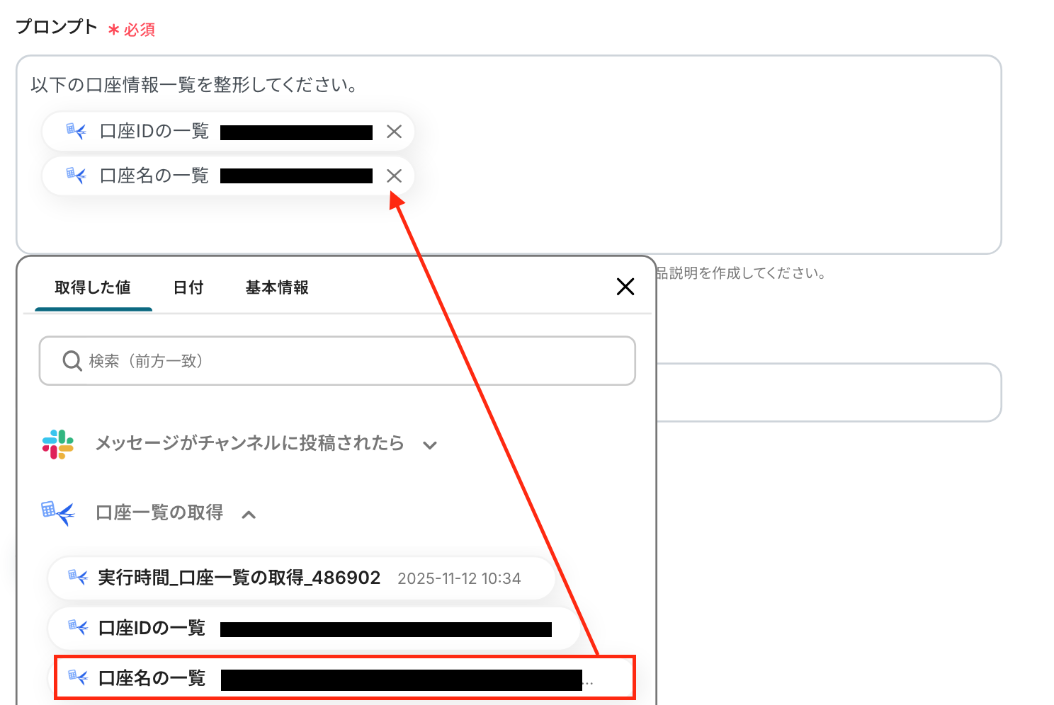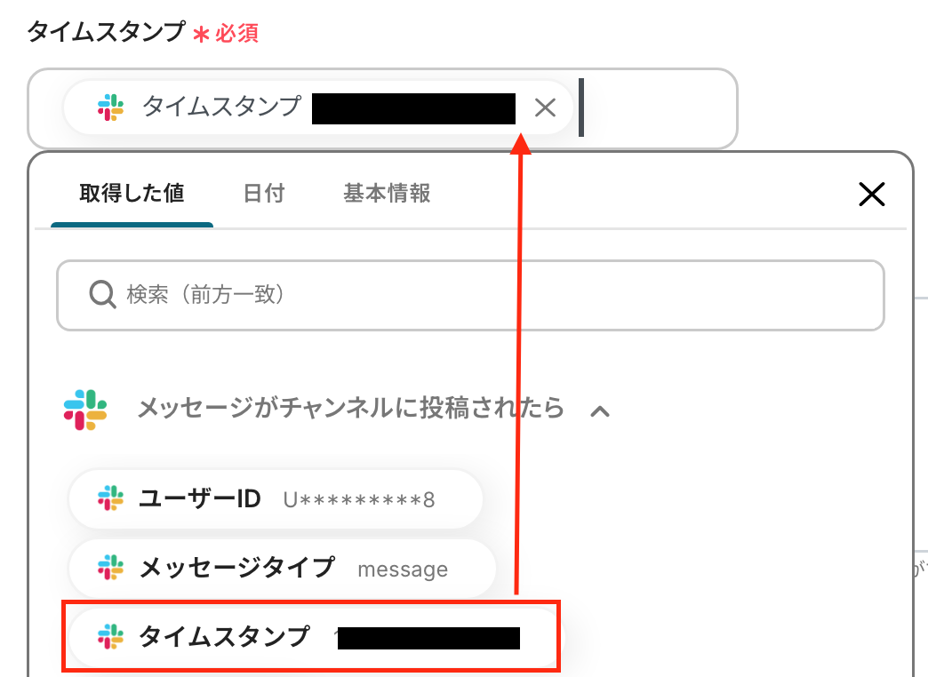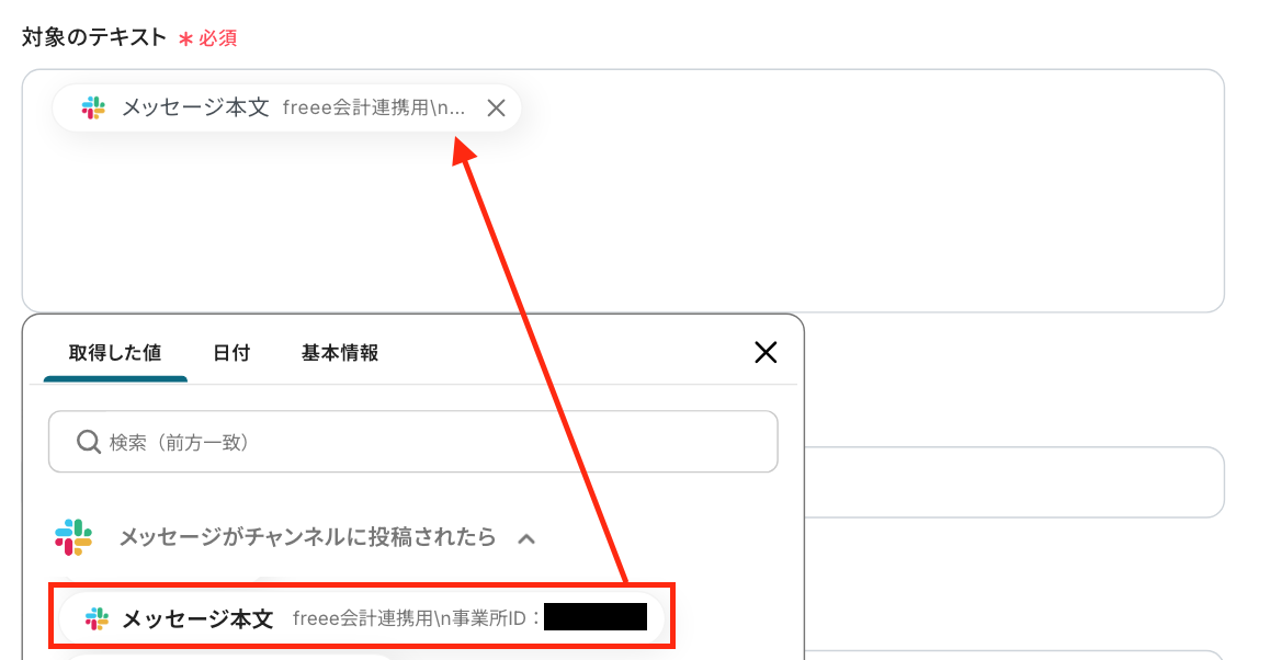 以下の画像のように、入力欄をクリックして表示される取得した値を設定してください。