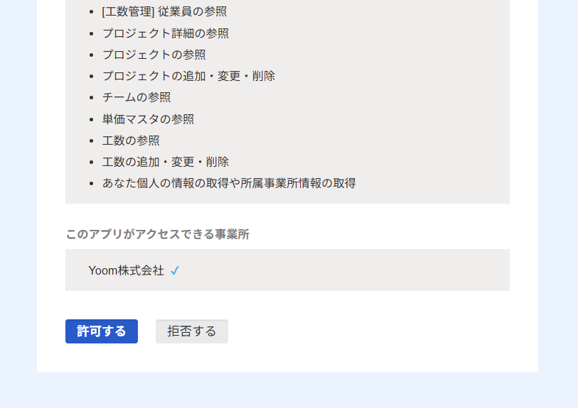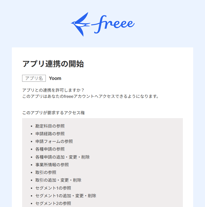 Yoomからfreee会計のアクセス権限を確認し、ページ下部の「許可する」をクリック。