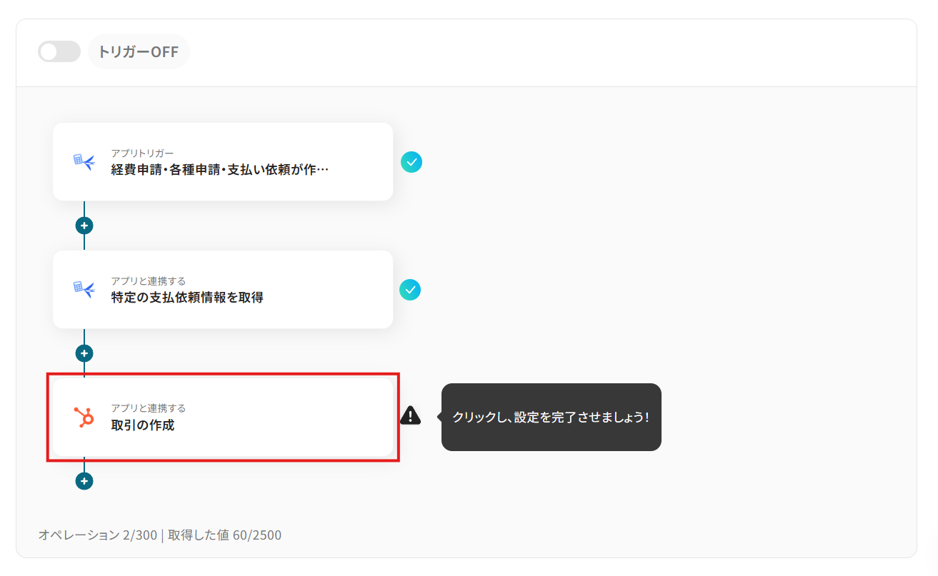 このフローでは「特定の金額以上」や「特定の取引先」といった条件に合致する支払い依頼がfreee会計で作成された場合のみ、HubSpotにも取引を作成します。