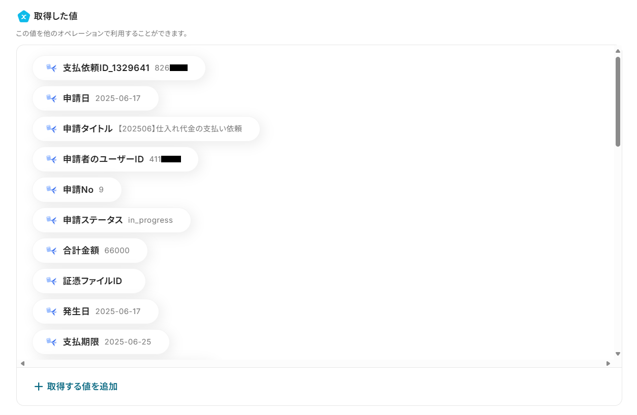テストに成功すると、「取得した値」に指定した支払依頼の詳細情報が追加されます。