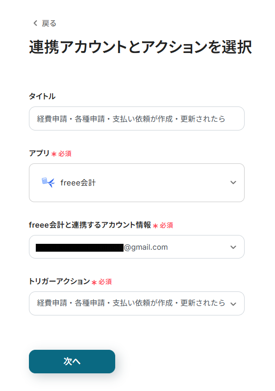 連携アカウントとアクションを確認し、「次へ」をクリック。