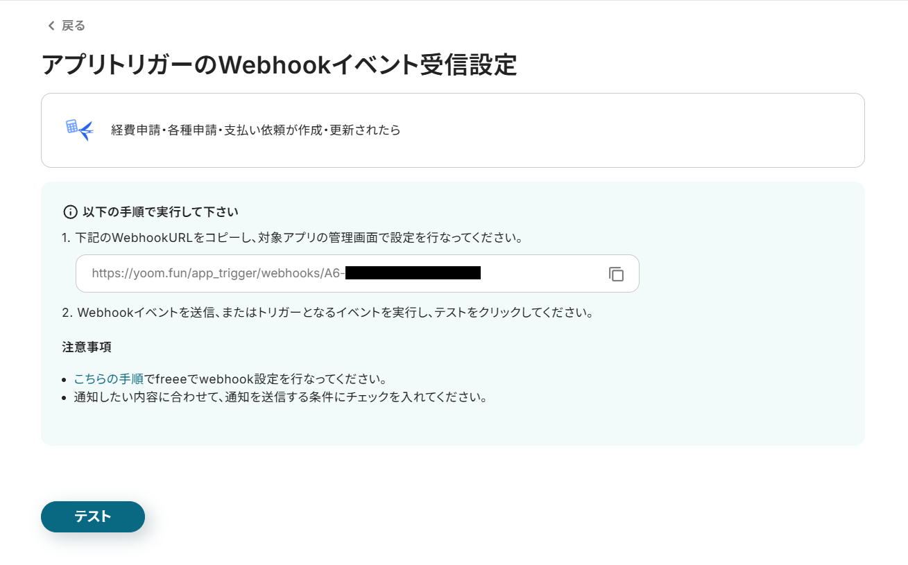 Yoomとの連携用にfreeeアプリを作成し、Webhookを設定してください。