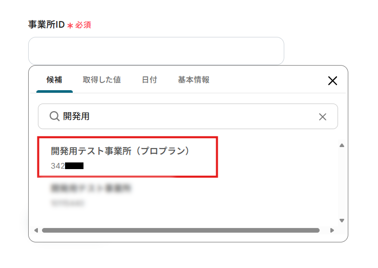 入力欄をクリックすると、連携しているfreee会計アカウントから候補が表示されるため、対象となる事業所を選択してください。