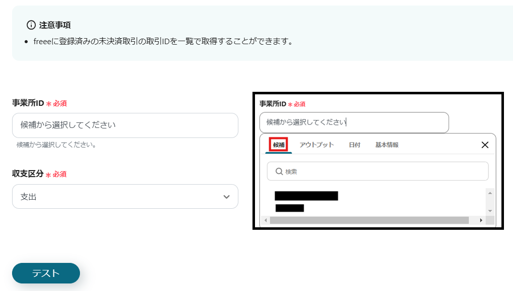 3.「事業所ID」を、枠をクリックして表示される「候補」から選択し、「テスト」をクリックします。