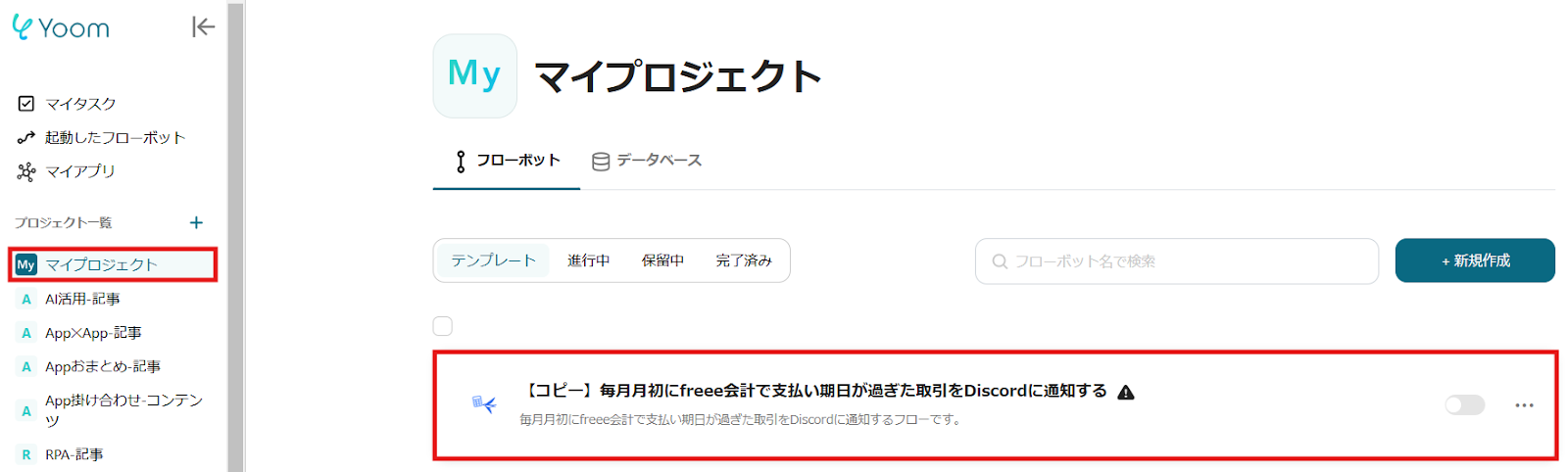 1.Yoom管理画面の「マイプロジェクト」をクリックし、「【コピー】毎月月初にfreee会計で支払い期日が過ぎた取引をDiscordに通知する」をクリックします。