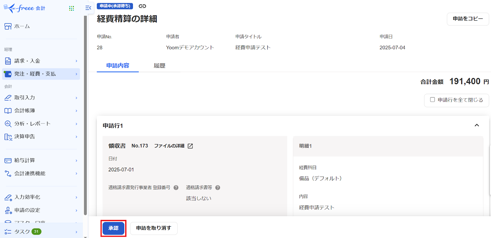 次にテスト用の経費申請を作成し、承認までします。