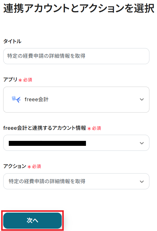 ステップ3と同様、アクションは「特定の経費申請の詳細情報を取得」のまま「次へ」をクリックしましょう。