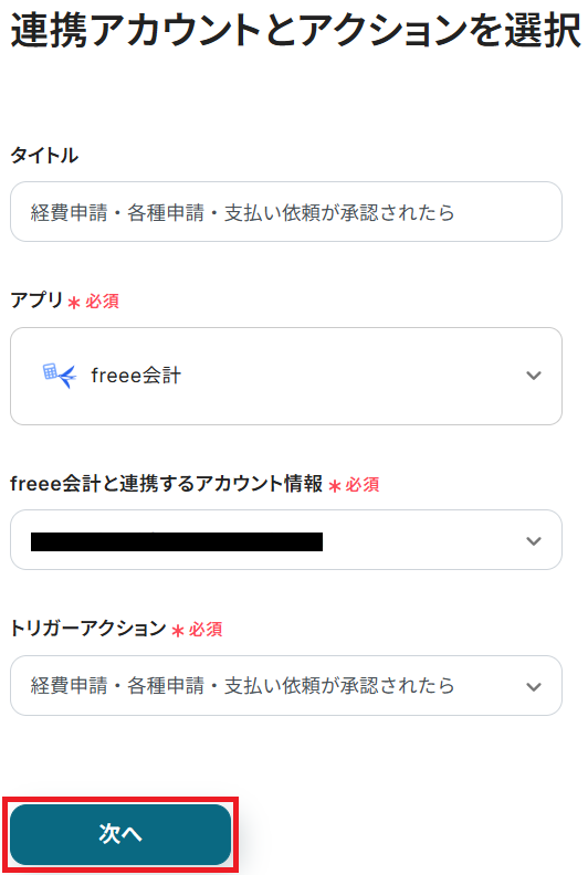 タイトルと連携するアカウント情報を任意で設定し、トリガーアクションはテンプレート通りに「経費申請・各種申請・支払い依頼が承認されたら」のまま「次へ」をクリックしましょう。
