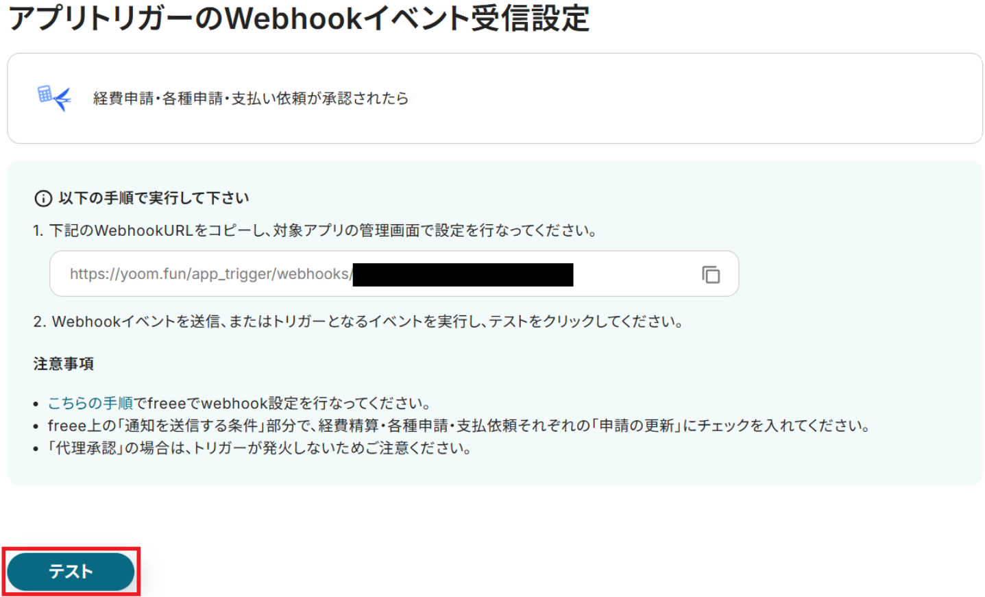 まずこちらを参考に、freee会計でWebhookの設定をしてください。