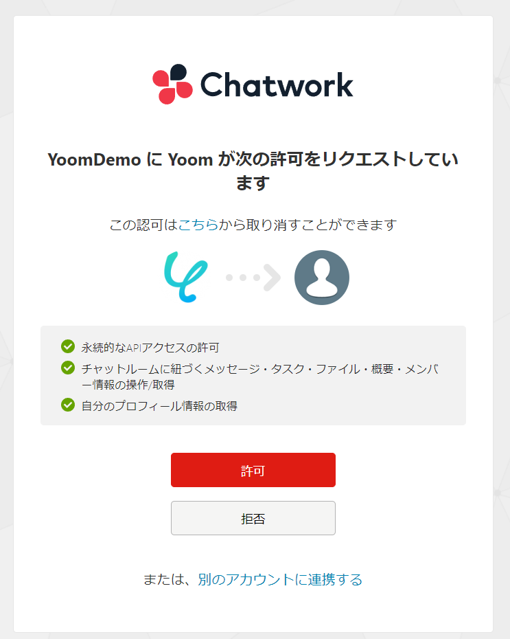 許可を押すとYoomの画面に移行します。これでChatworkとYoomの連携は終了です。