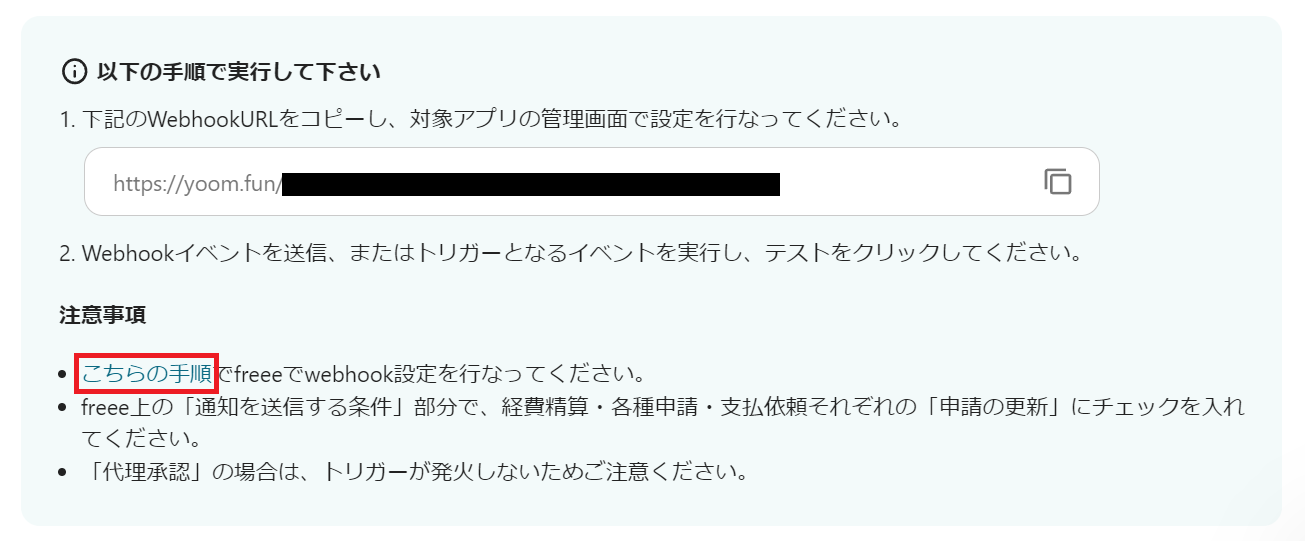 画像の赤枠内のfreeeのWebhookイベント設定に詳しい説明があるので、そのページを確認しながら設定してくださいね!