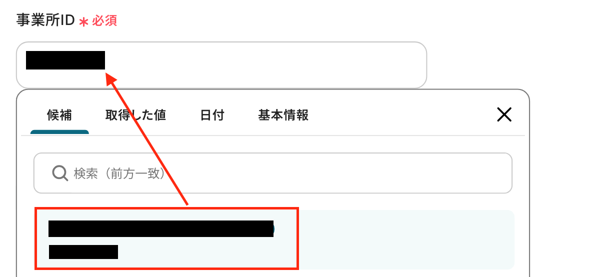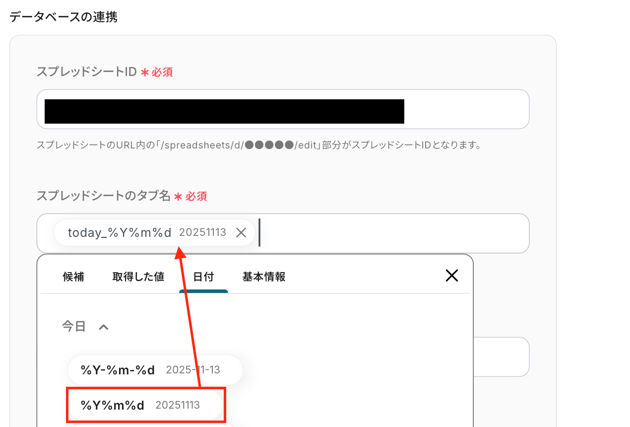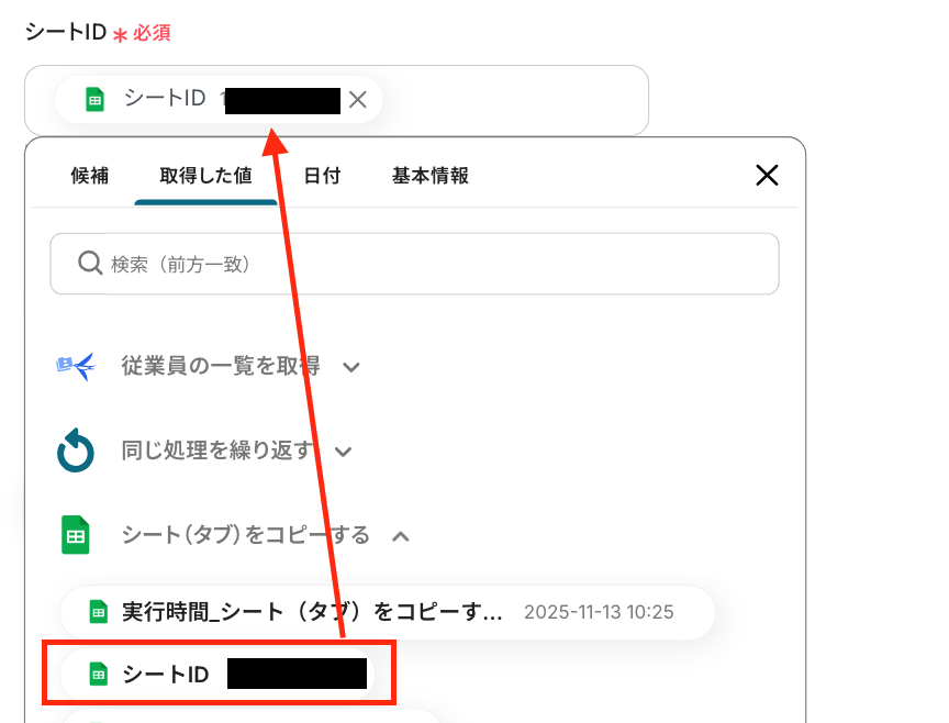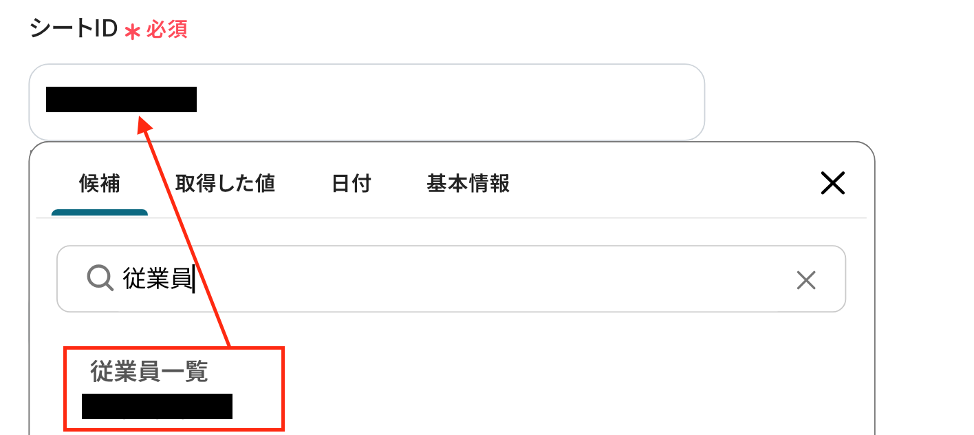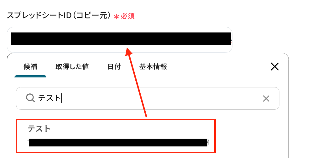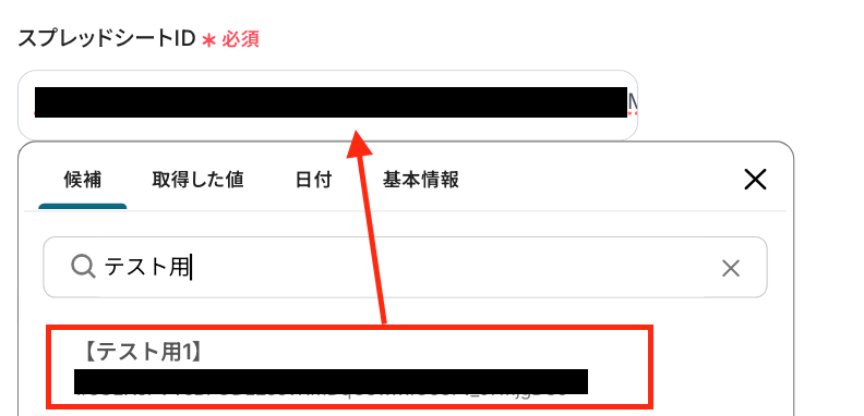入力欄をクリックして表示される候補から、ステップ5でコピーしたシートが格納されているスプレッドシートIDを選択してください。