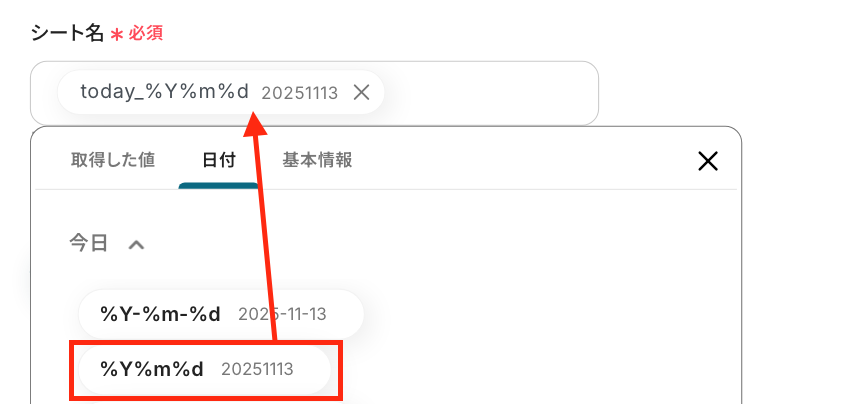 今回は、シート名を今日の日付に変更したので、入力欄をクリックし「日付→今日」を選択してください。