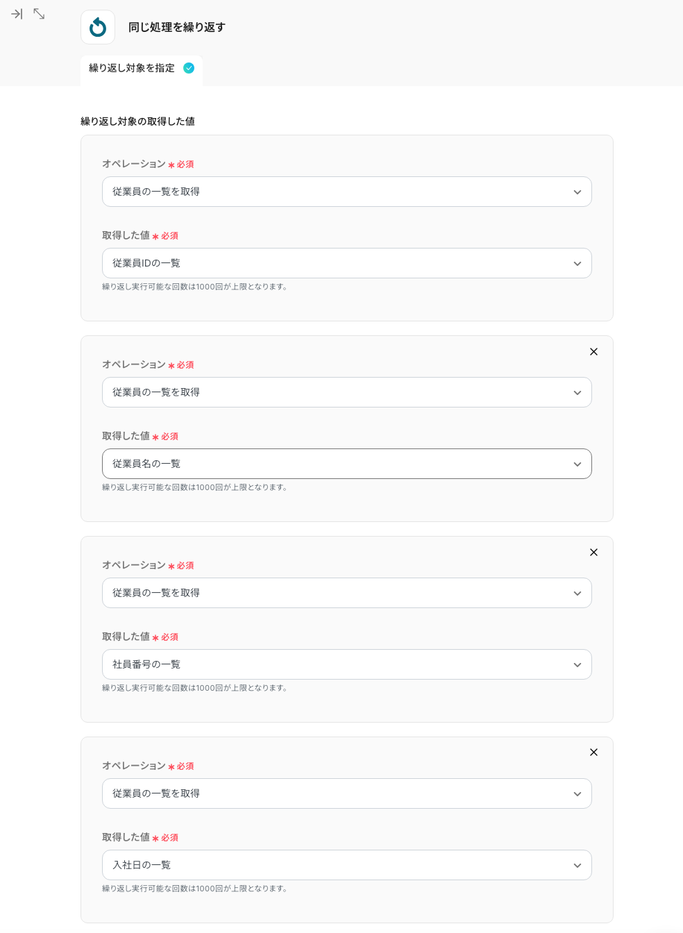 各項目には、「同じ処理を繰り返す」設定で取得した値を設定してください。