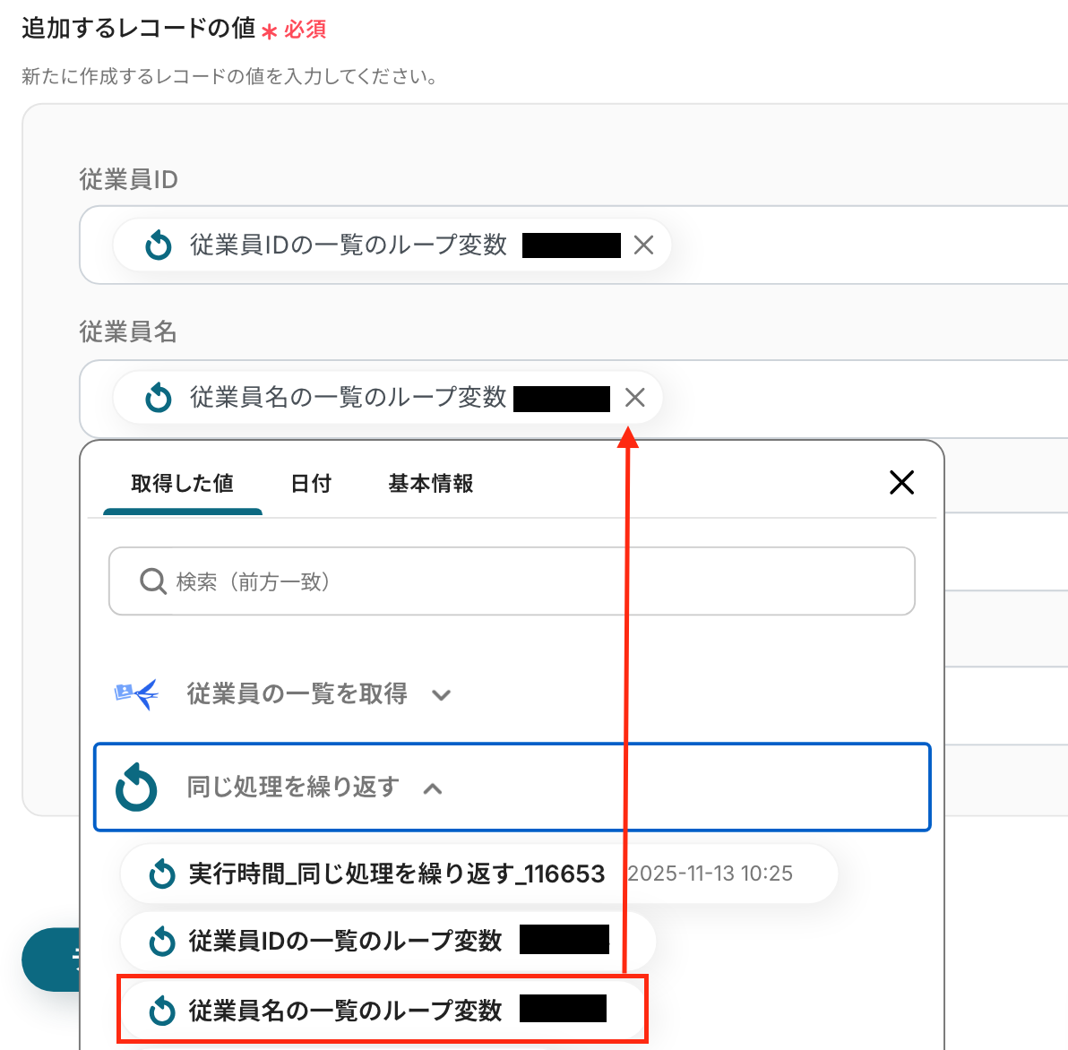 続いて、繰り返し対象を指定する画面で「繰り返し対象の取得した値」を設定します。