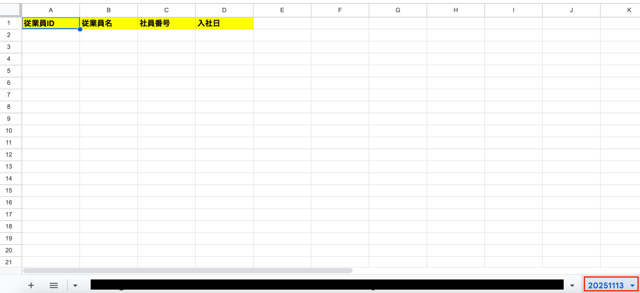 Google スプレッドシートの画面に移り、シート名が変更されたか確認してみましょう。