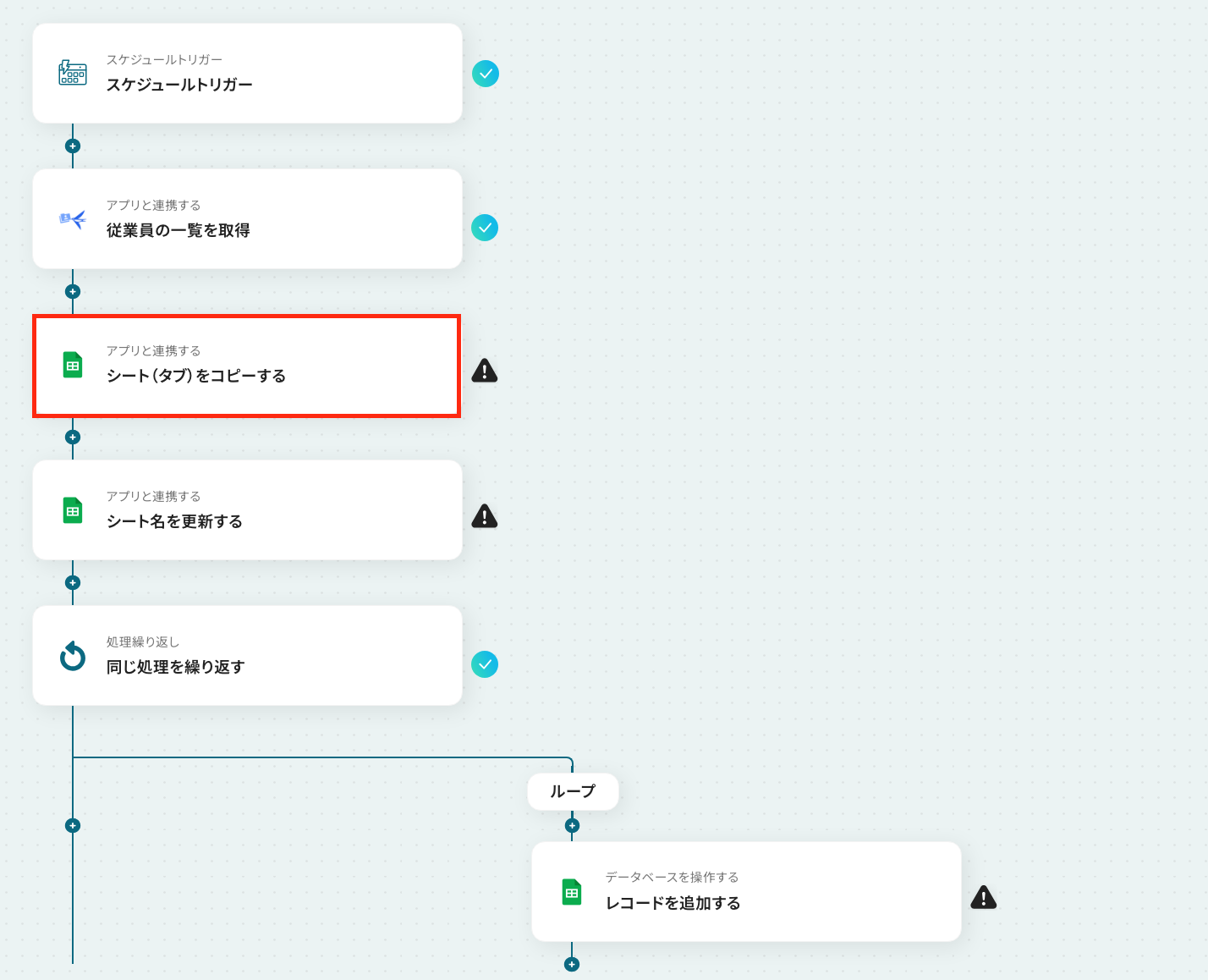 ここでは、Google スプレッドシートから特定のシートをコピーして新しくシートを作成する設定を行います。