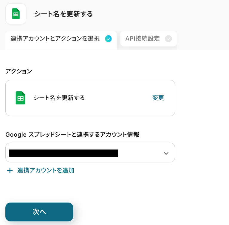 アクションはそのままで、連携するアカウント情報を確認します。