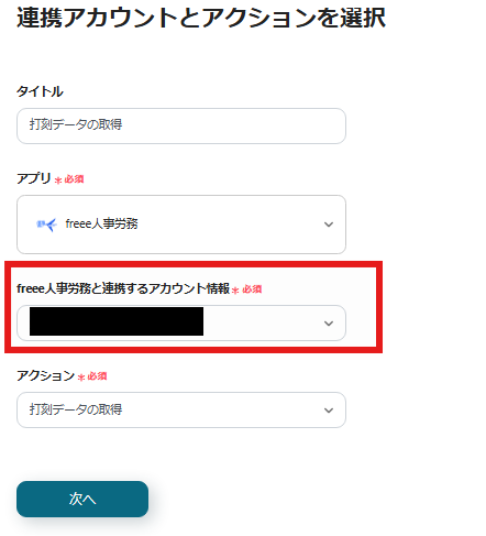 以下の画像の赤枠内が今回連携するアカウントであることを確認し、「次へ」ボタンをクリックします。