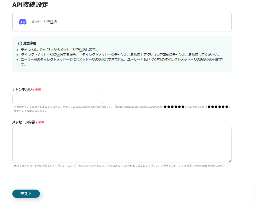 内容を入力できたら「テスト」ボタンをクリックしましょう。