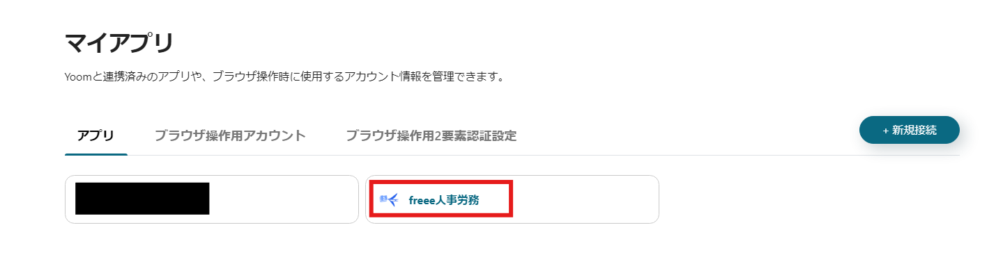 freee人事労務のマイアプリ登録と同じように、画面右側の「新規接続」をクリックします。
