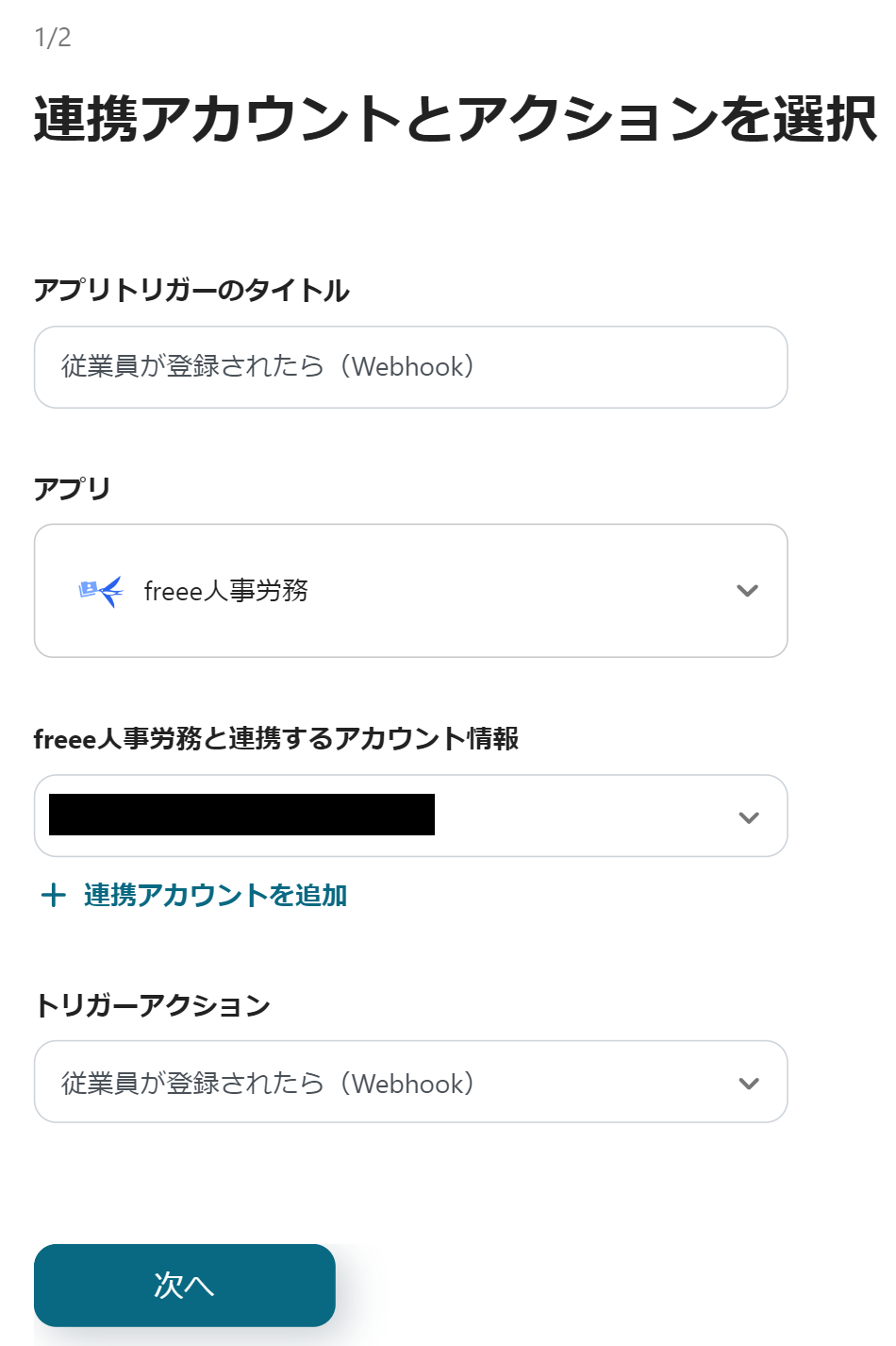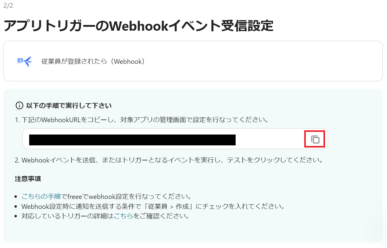※Webhook設定時に通知を送信する条件で「従業員>作成」にチェックを入れてください。