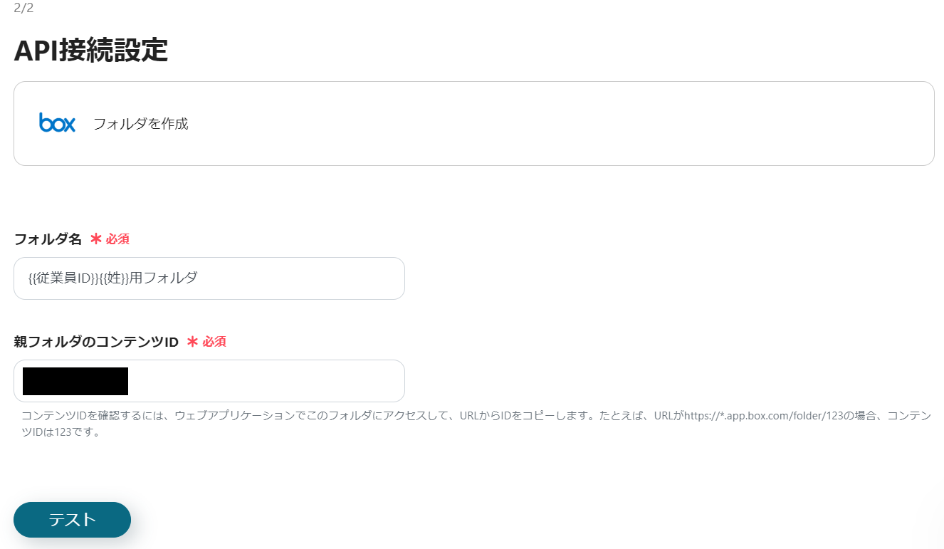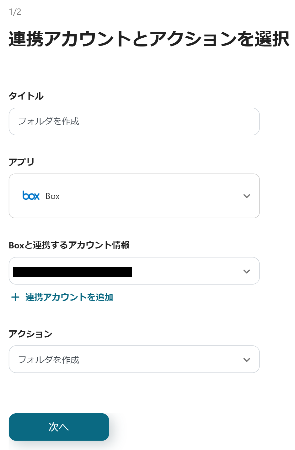 次にBoxの設定を行うので、「フォルダを作成」をクリックしましょう。