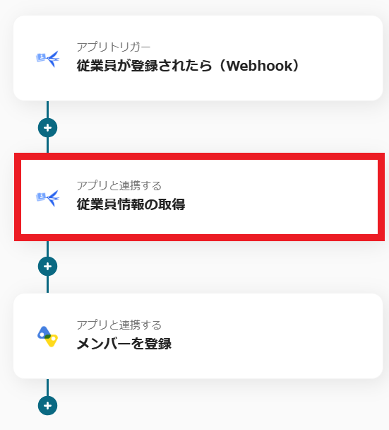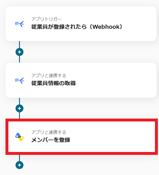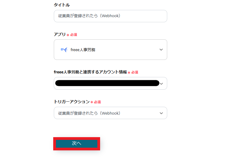 トリガーは、「従業員が登録されたら(Webhook)」を選択します。