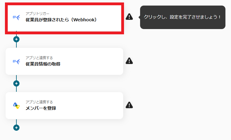 1.まず、一番上の「従業員が登録されたら(Webhook)」をクリックします。