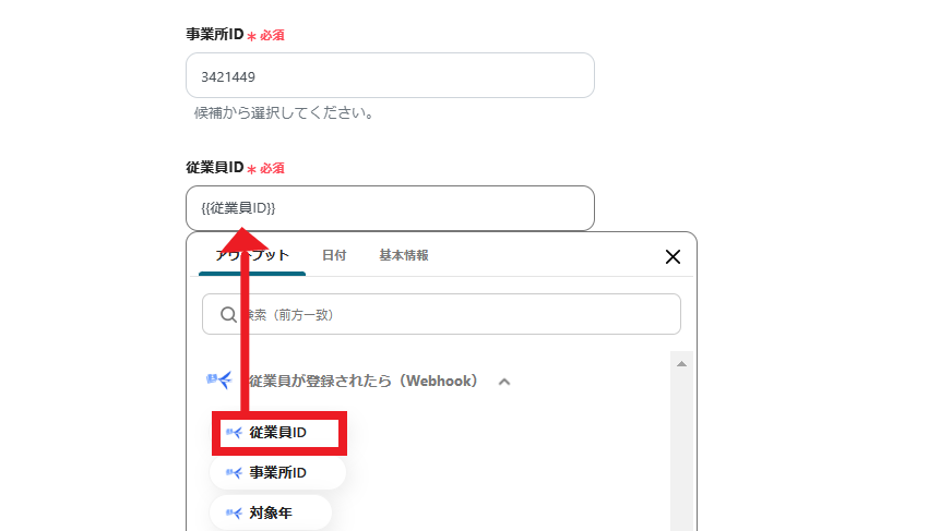 事業所IDは候補から、その他は先ほど取得したアウトプットから選択してください。