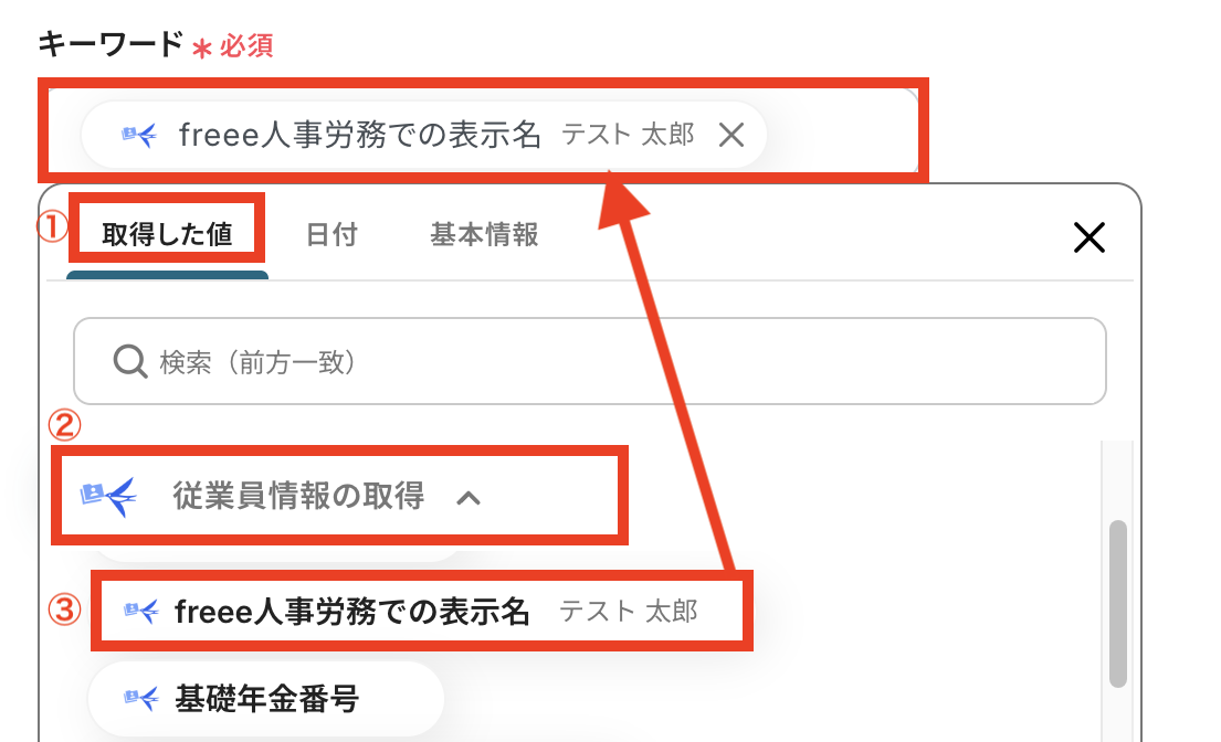 「キーワード」はステップ4で取得した値「freee人事労務での表示名」を入力します。
