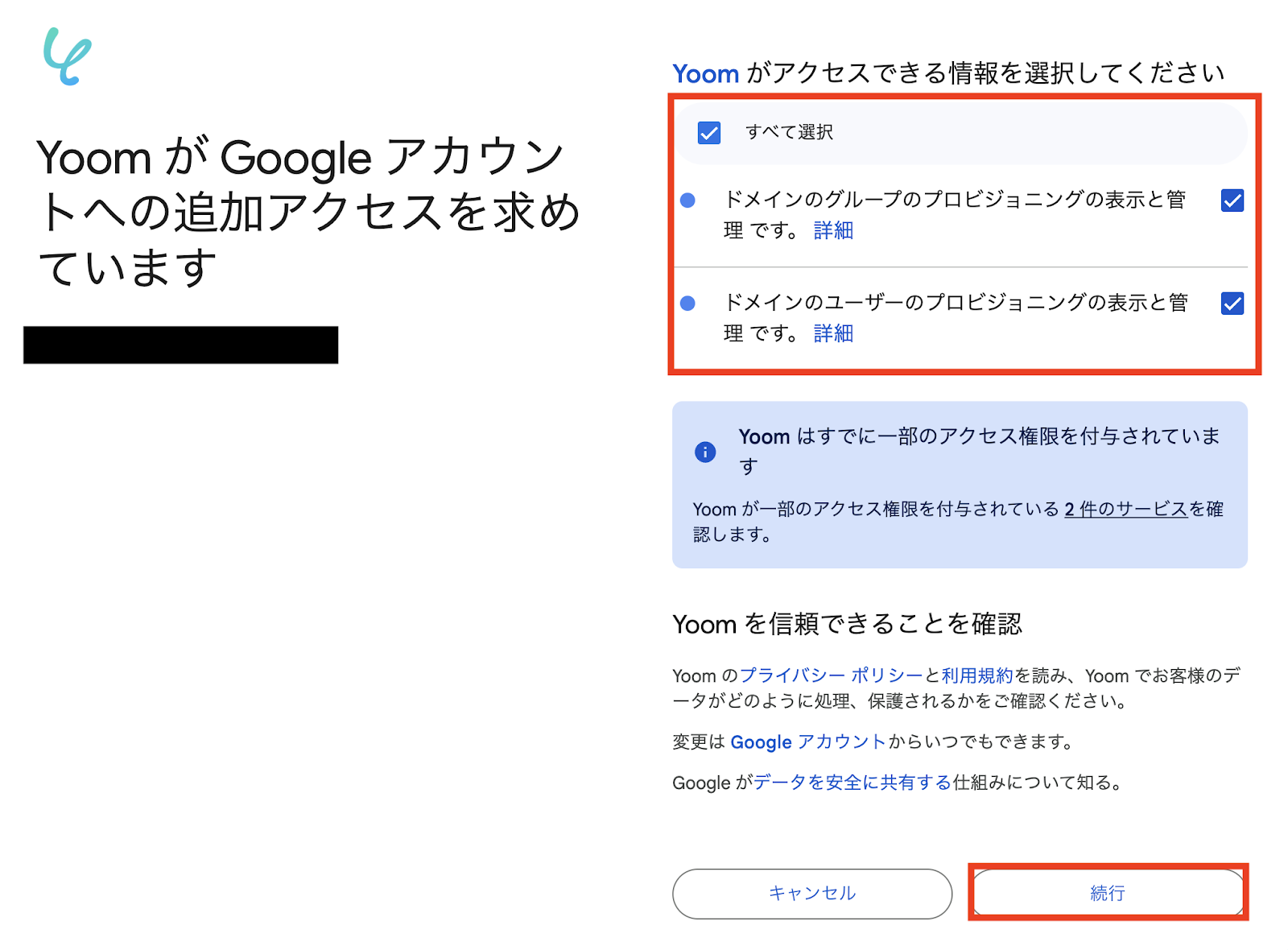 Google Workspaceと連携するアカウント情報:合っているか確認