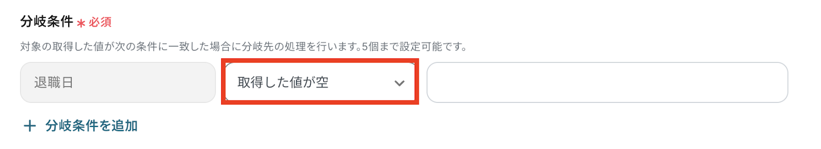 今回は「退職日」が入力がされているかどうか(ステップ4で「退職日」がアウトプットされたかどうか)で分岐設定します!