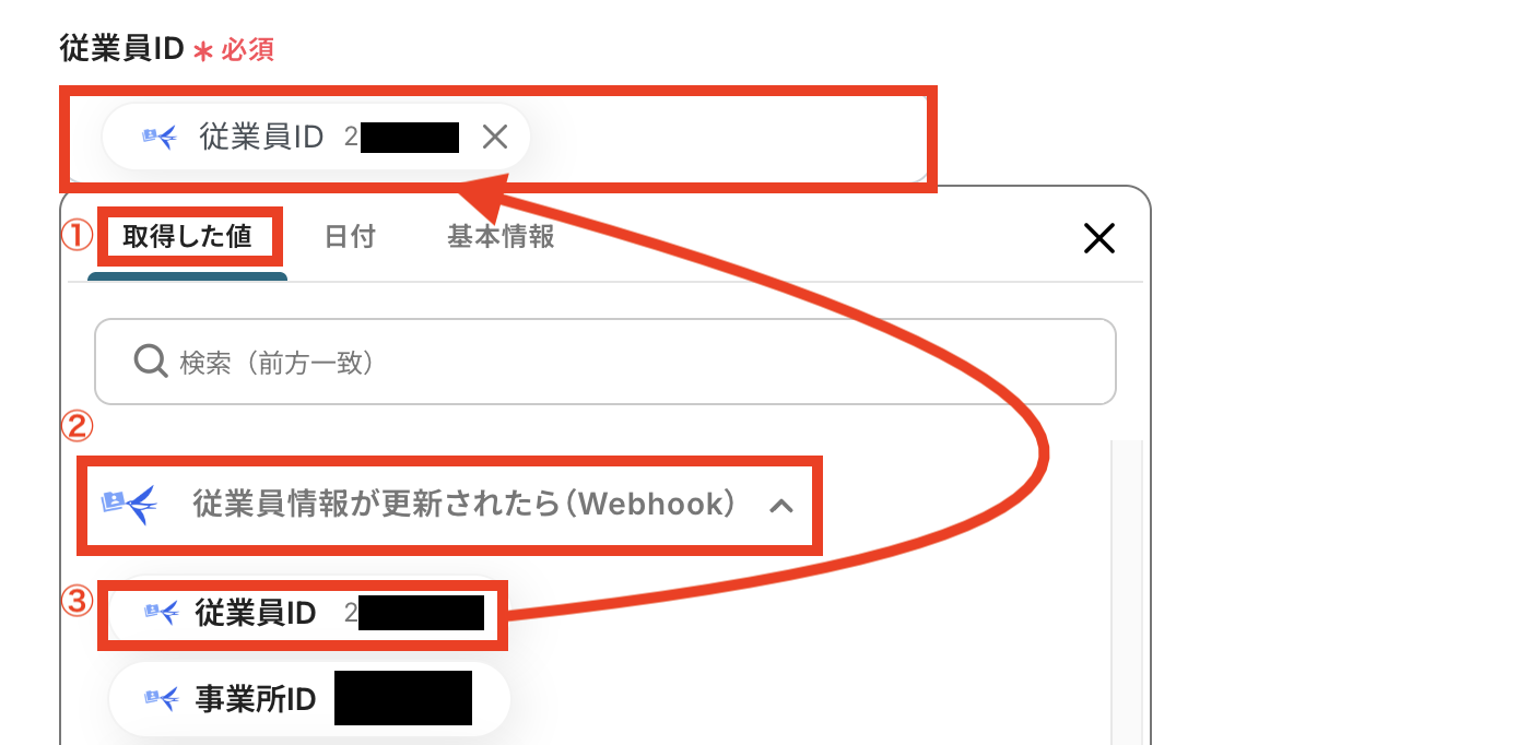 ③「従業員ID」などを選択