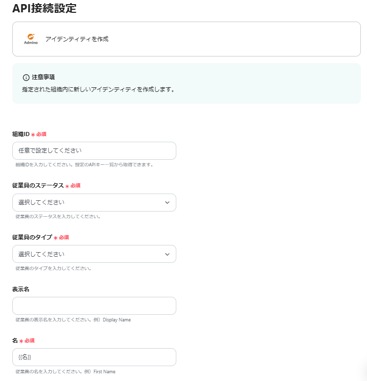 ・従業員のステータス:任意の内容を入力します。