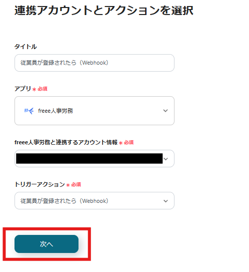 連携アカウントとアクションを選択の画面が表示されるため、今回連携するfreee人事労務のアカウントで間違いないかを確認し「次へ」をクリックします。